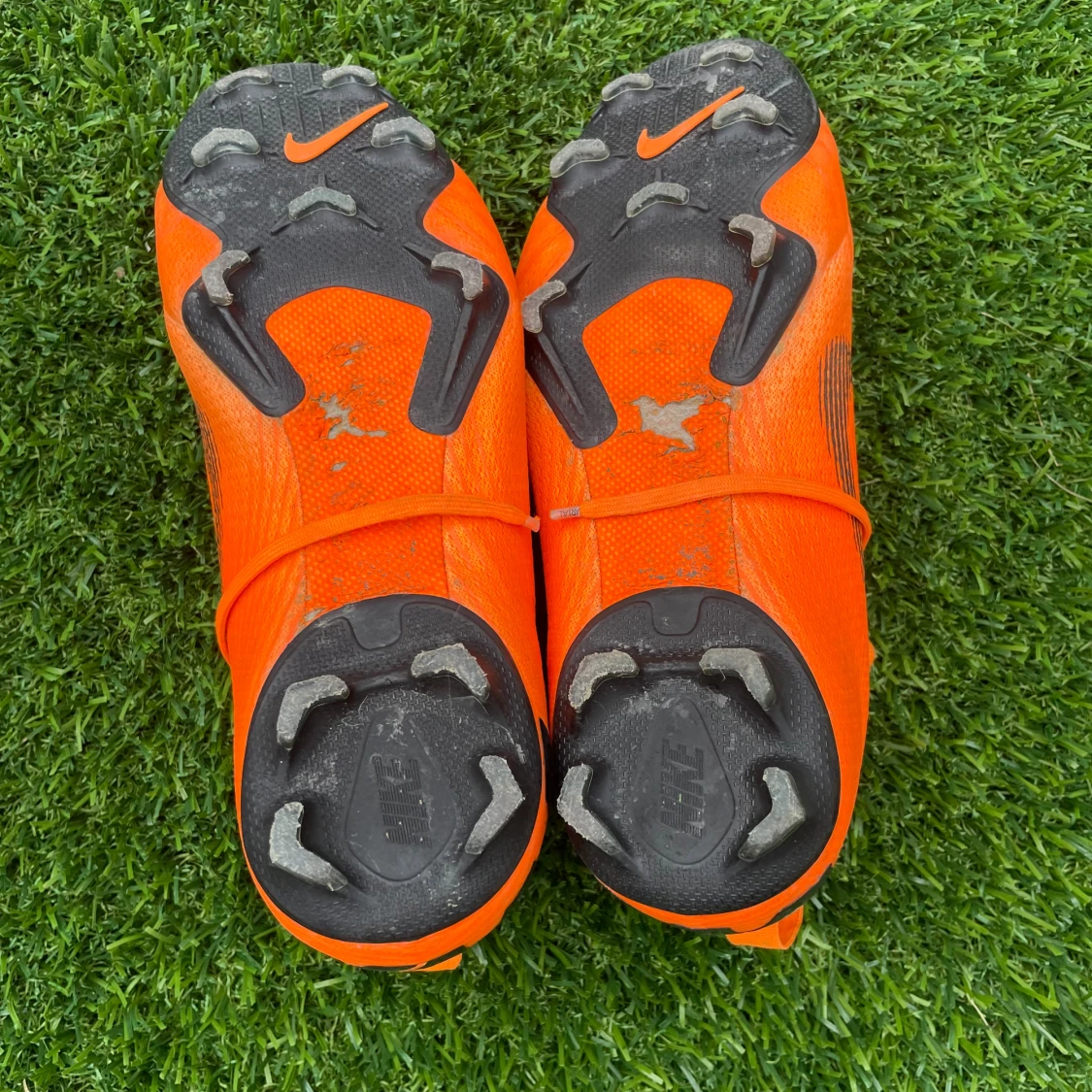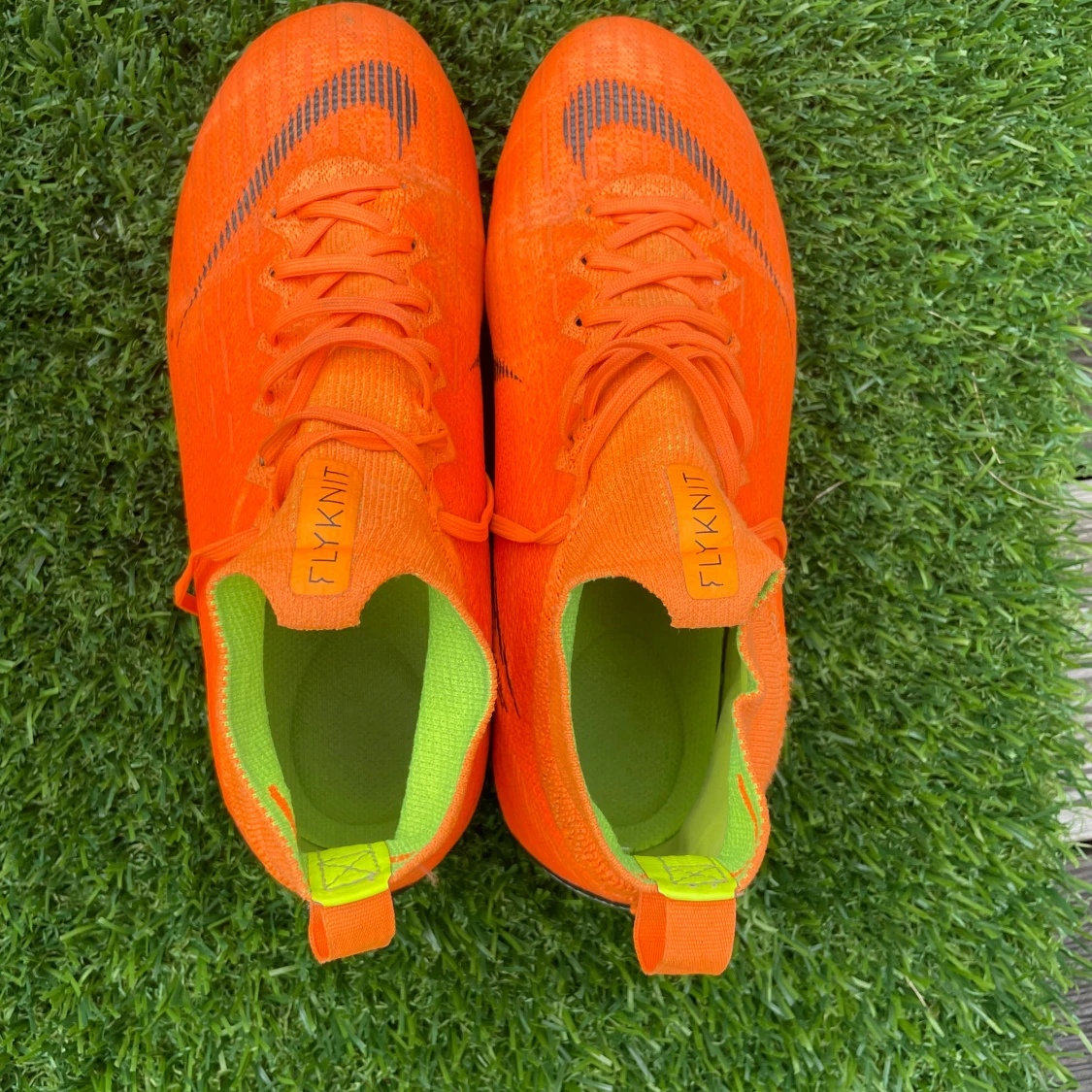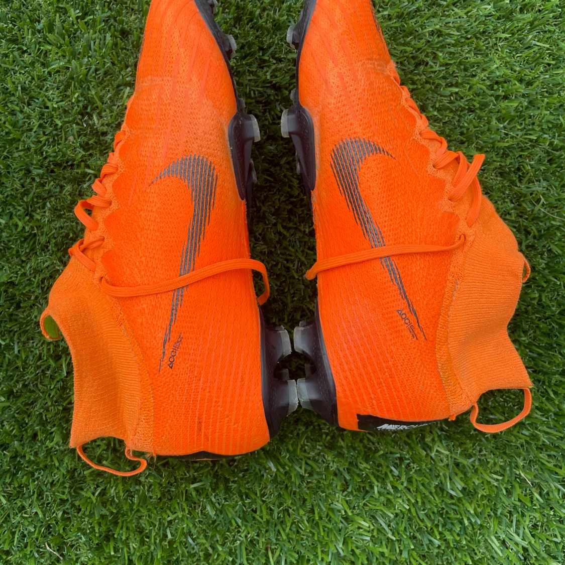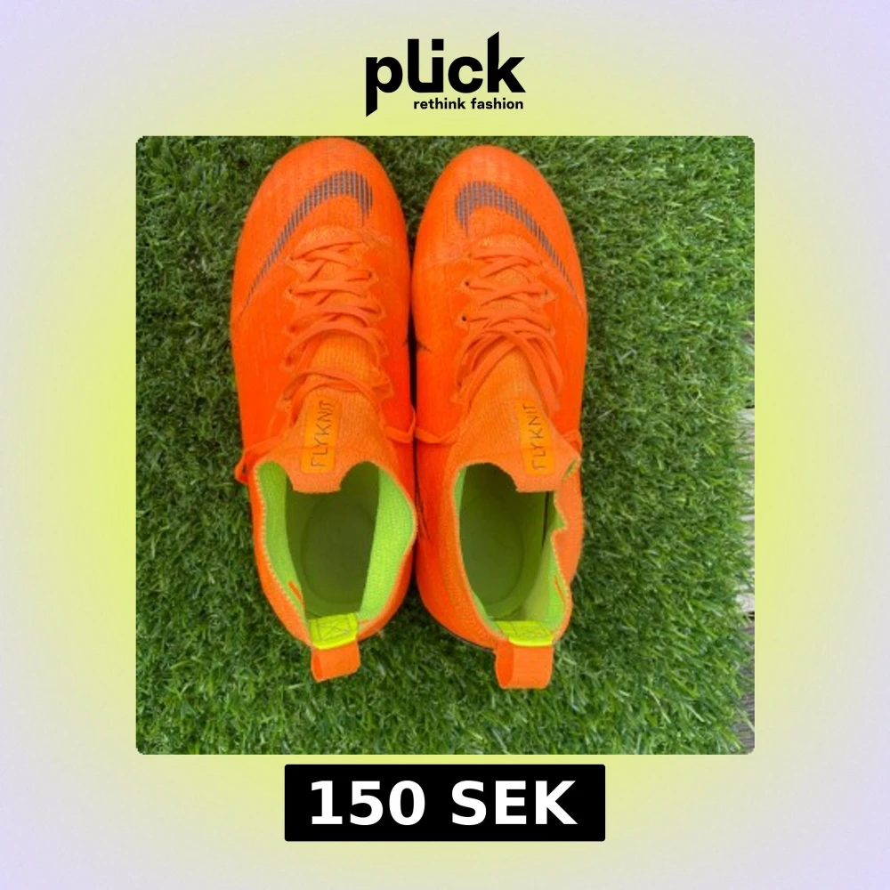 Säljer ett par grymt snygga fotbollsskor från Nike i en riktigt skrikig orange färg med svarta detaljer och Nike-logga. Skorna är tillverkade i lätt och smidig flyknit med snörning och har gröna innersulor. Perfekta för dig som vill sticka ut på planen!