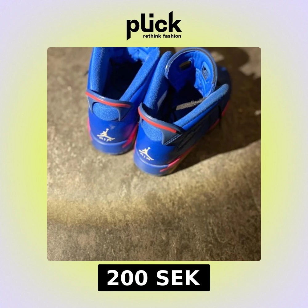 Snygga blå Nike Air Jordans med svarta snören och röda detaljer. Skorna har en ikonisk design med Jumpman-loggan på hälen och tungan. Perfekta för dig som vill ha en sportig och stilren look.