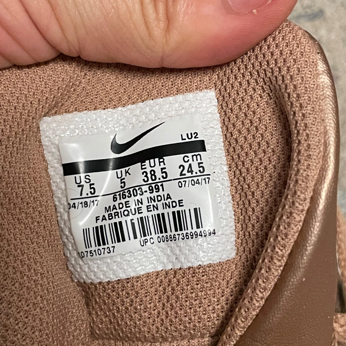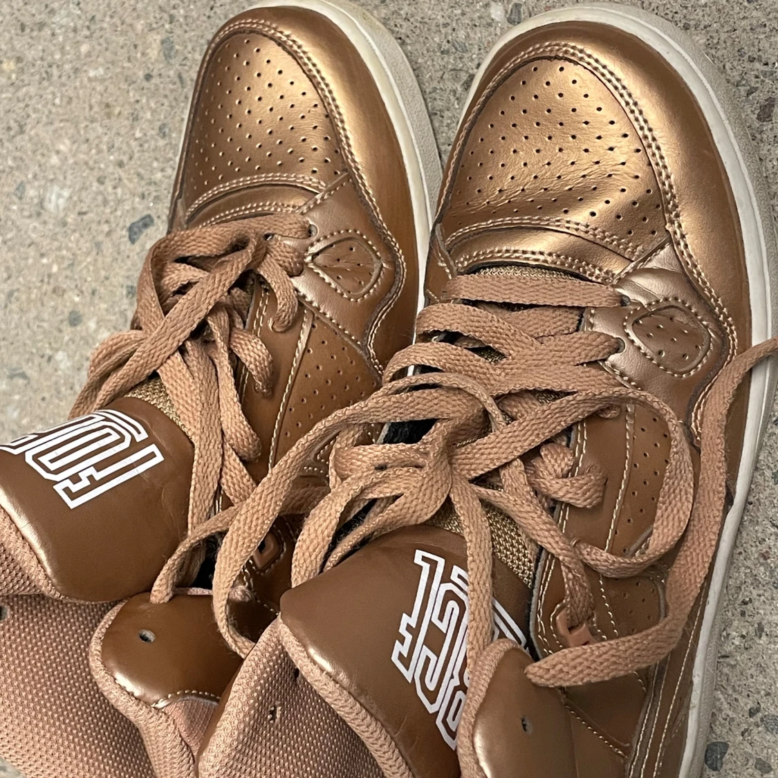 Nike Air Force sneakers i metallic brons med högt skaft och klassisk snörning. Skorna har perforerad tå för extra ventilation och vit sula som kontrast. Snyggt FORCE-tryck på plösen och cool retrovibe. Perfekta för dig som vill sticka ut med din stil.