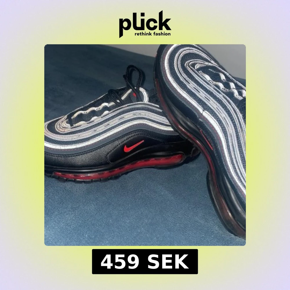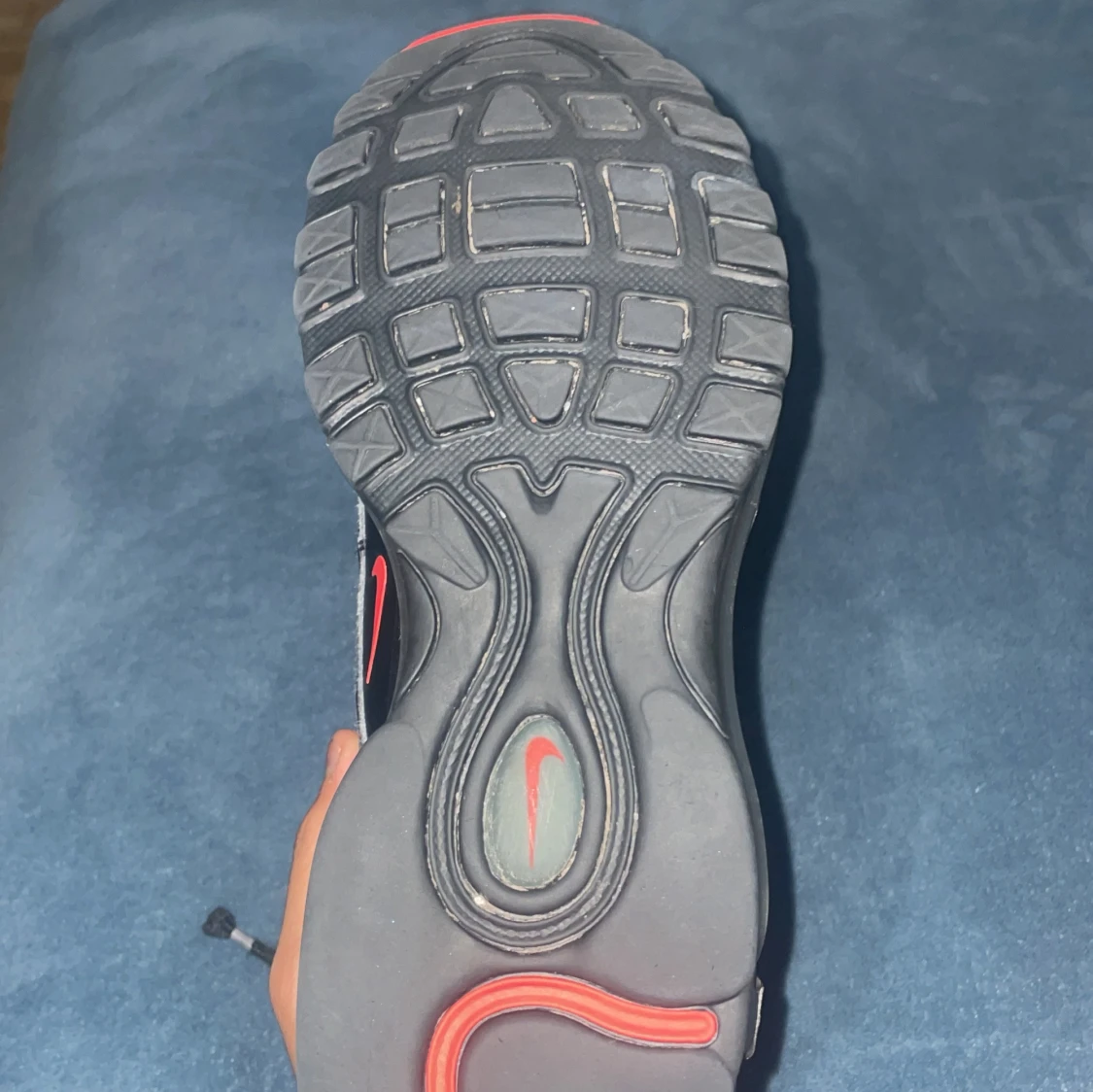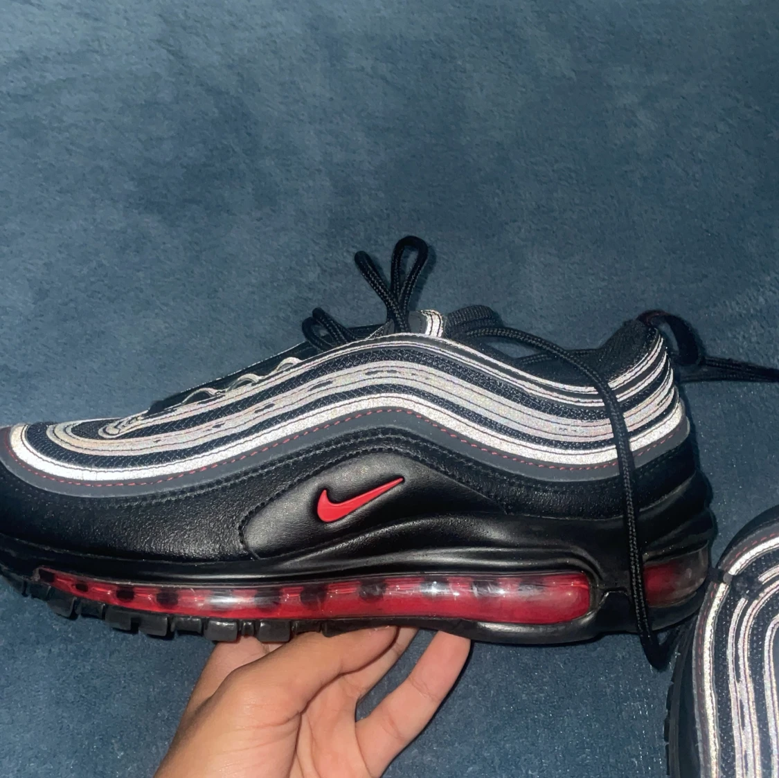 Snygga Nike Air Max 97 sneakers i svart med röda detaljer. Skorna har en ikonisk vågig design med synlig Air-enhet i sulan för extra komfort. Perfekta för en sportig look. Skorna kan ser ut och vara på en bra form.