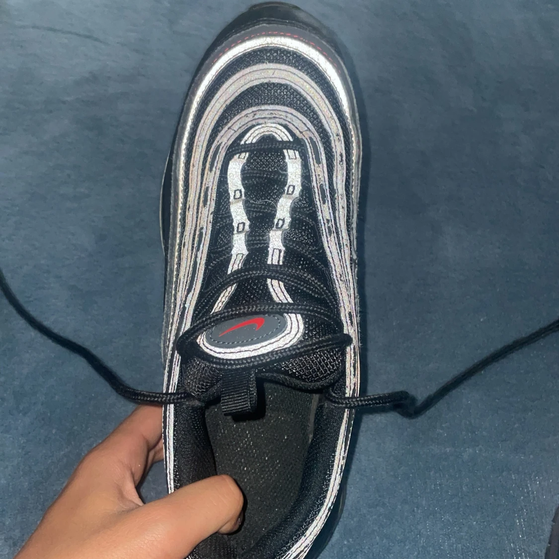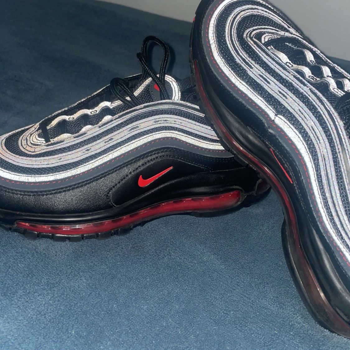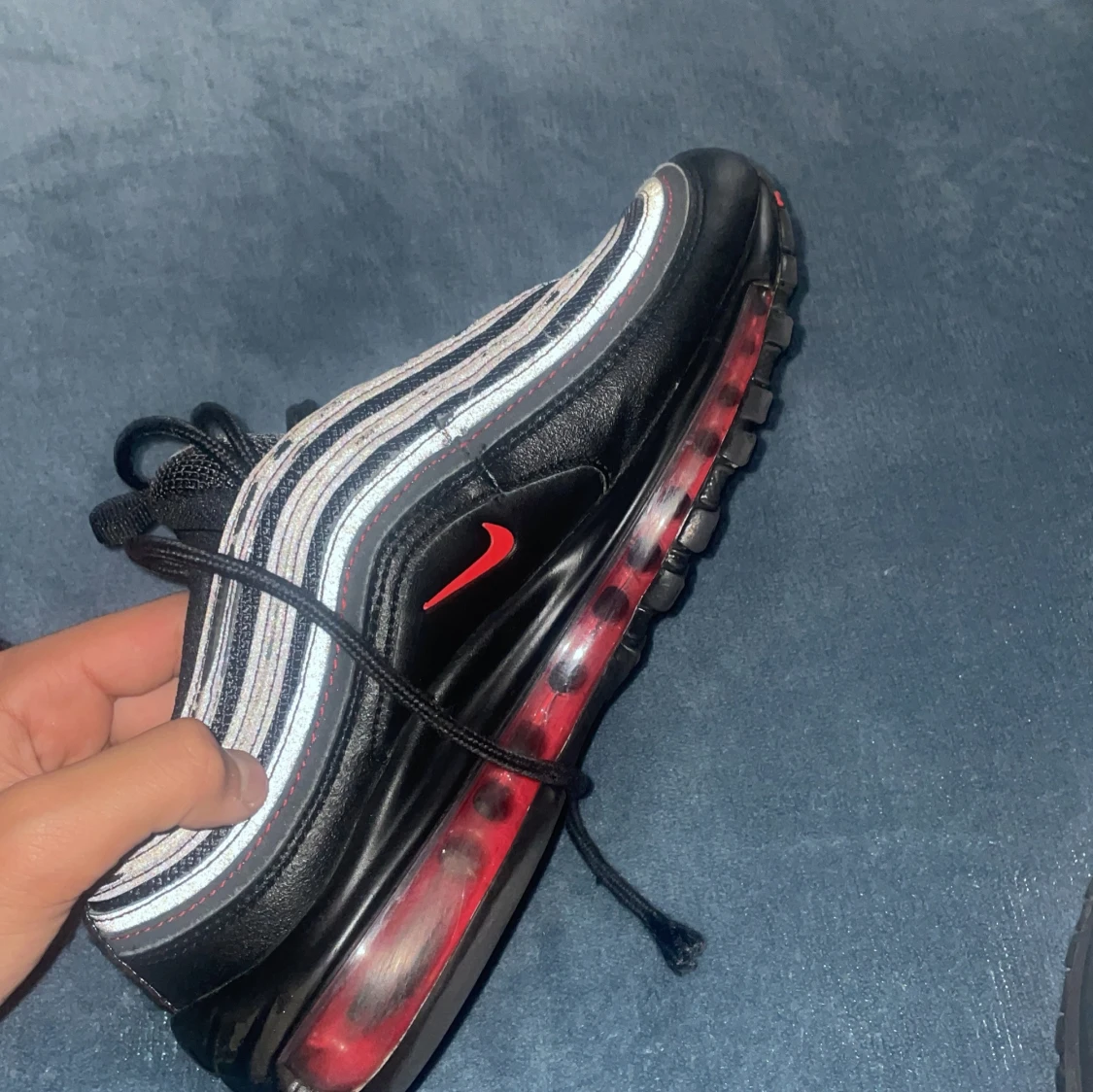 Snygga Nike Air Max 97 sneakers i svart med röda detaljer. Skorna har en ikonisk vågig design med synlig Air-enhet i sulan för extra komfort. Perfekta för en sportig look. Skorna kan ser ut och vara på en bra form.