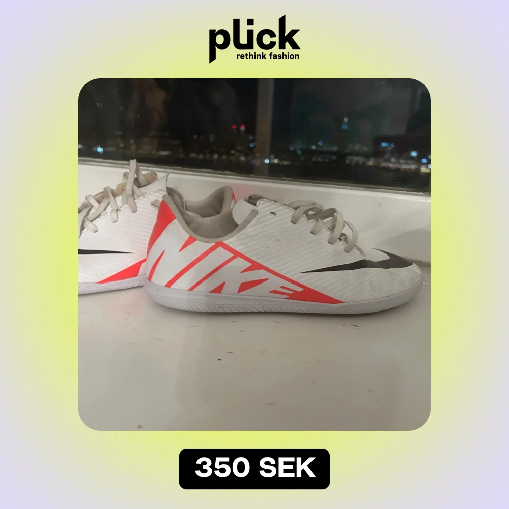 Säljer ett par vita Nike fotbollsskor i mycket bra skick. De har en snygg design med svarta och röda detaljer samt snörning. Perfekta för inomhusfotboll eller träning. Skorna är lätta och bekväma, vilket ger bra kontroll och fart på planen. Använd bara en Sasöng