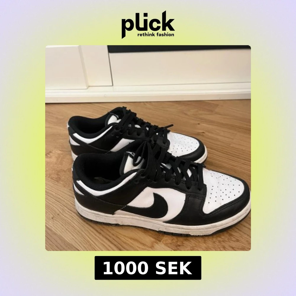 Säljer ett par Nike Dunk Low sneakers i svart och vitt. Skorna har klassisk låg siluett, svart swoosh och snörning. Ovandelen är i skinn och de har en platt sula med rund tå. Perfekta för dig som gillar streetstyle och vill ha en ikonisk look.