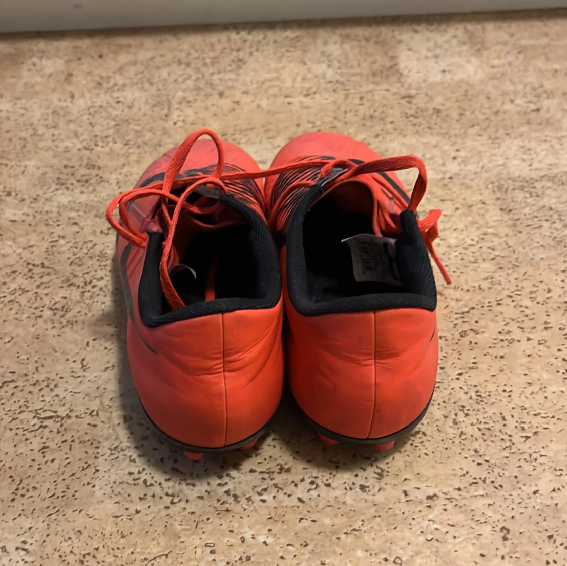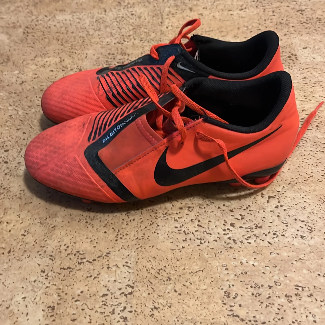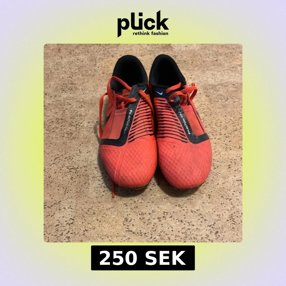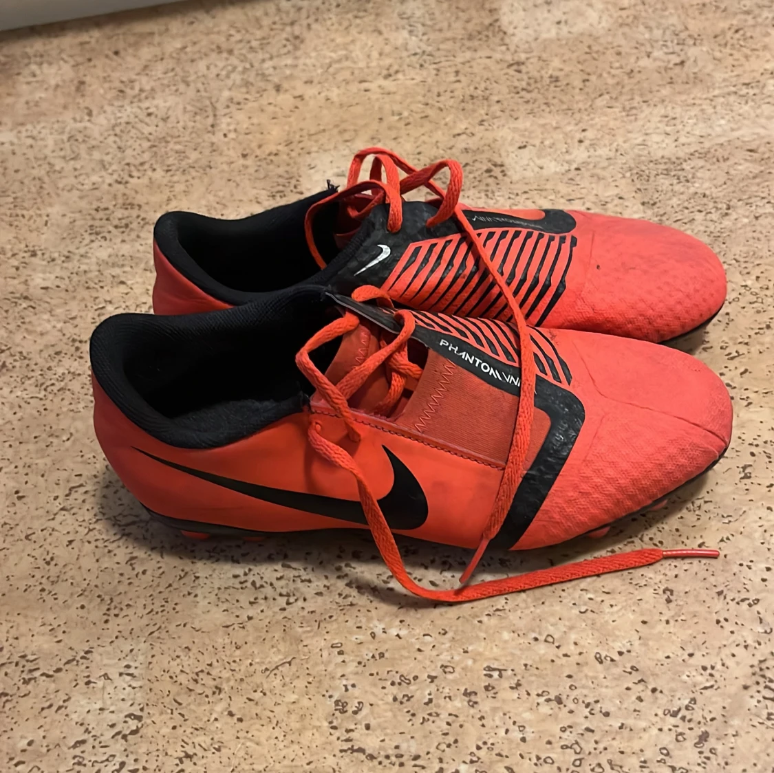 Säljer ett par Nike Phantom VNM fotbollsskor i en riktigt snygg röd färg med svarta detaljer och snörning. Skorna har en rund tå och är designade för grym kontroll på planen. Ovandelen är i syntetmaterial och insidan är svart för extra kontrast. Perfekt för dig som vill sticka ut på matchen!