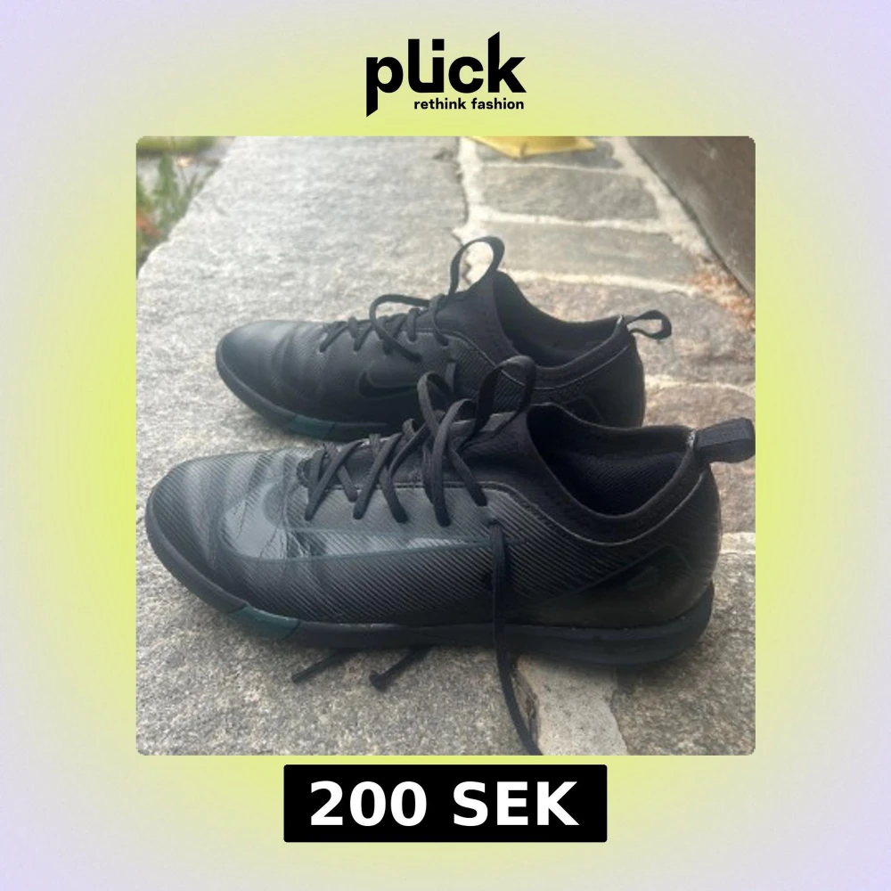 Snygga svarta Nike fotbollsskor med diskret Swoosh-logga på sidan. Skorna har snörning, låg profil och är tillverkade i syntetmaterial med texturerad yta för bättre bollkontroll. Sulan är mönstrad och har detaljer i mörkgrönt. Perfekta för dig som vill ha stilrena skor på planen.