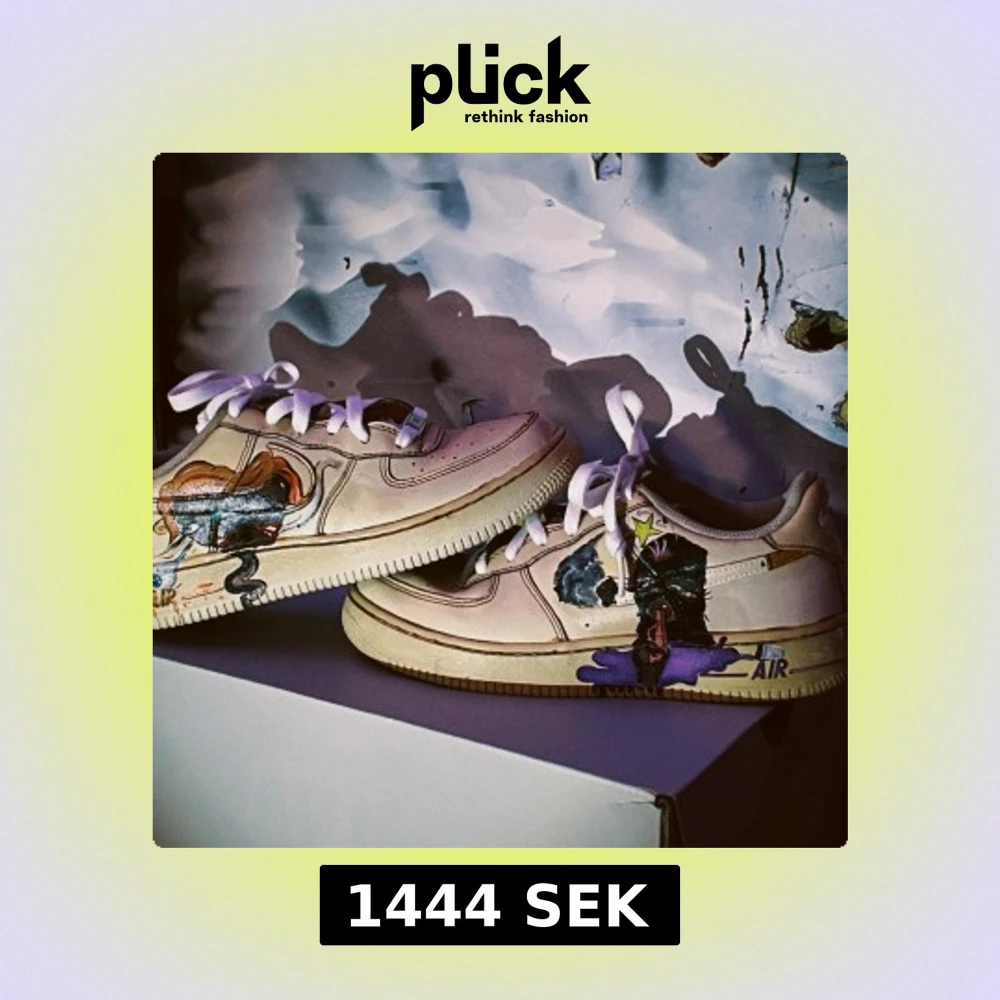 Unika Nike Air Force sneakers med handmålad konstnärlig design i olika färger. Skorna har en bas i vitt med detaljer i blått, lila och svart. Perfekt för den som vill ha något annorlunda och personligt.