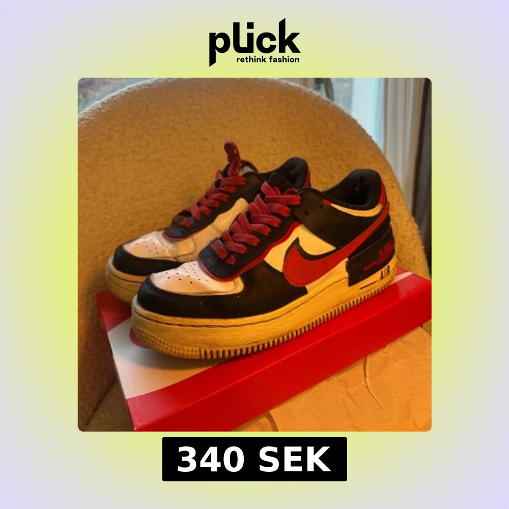 Nike Air Force 1 sneakers i svart, rött och vitt med klassisk röd swoosh och matchande röda skosnören. Skorna har en platt sula och rund tå, tillverkade i skinn med perforerade detaljer på tån för extra ventilation. Snygg kontrast mellan färgerna och ikonisk Air-detalj på hälen.