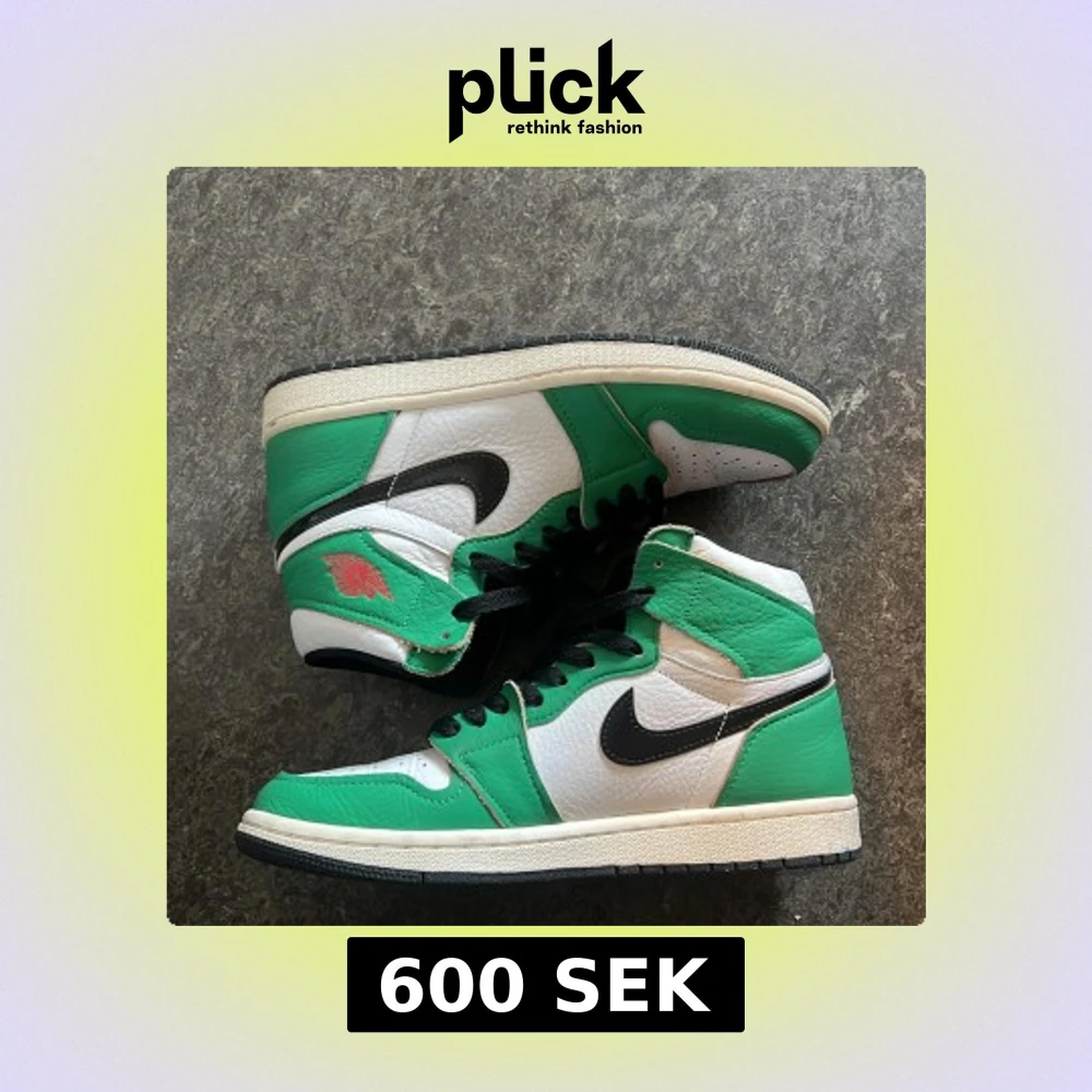 Säljer ett par Nike Air Jordan 1 Retro High med grön och vit ovandel i skinn, svarta detaljer och klassisk svart swoosh. Skorna har svart snörning och en vit mellansula med svart yttersula. Perfekta för dig som vill sticka ut med en ikonisk sneaker.