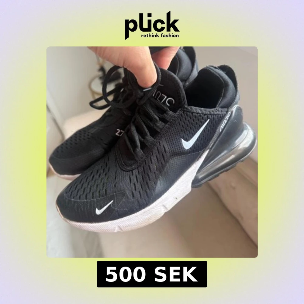 Svarta Nike Air Max 270 sneakers med vit sula och stor synlig Air-enhet i hälen. Ovandelen är i ventilerande syntetmaterial med diskreta perforeringar och vita Nike-loggor på sidan och tån. Klassisk snörning och sportig vibe, perfekt för dig som gillar streetstyle.