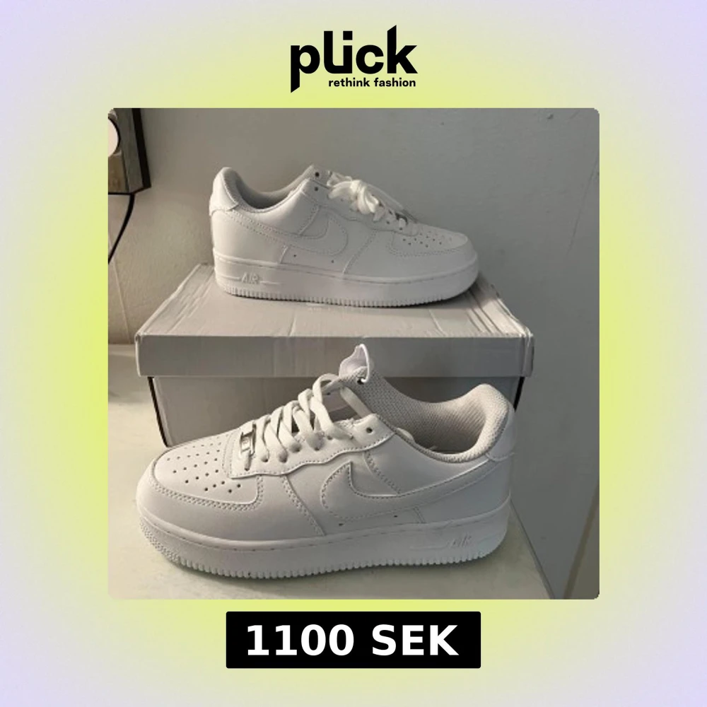 Klassiska Nike Air Force 1 sneakers i helvitt skinn med perforerad tå, vit sula och snörning. Ikonisk siluett med rund tå och diskret Nike-logga på sidan. Perfekta för en clean och stilren look.