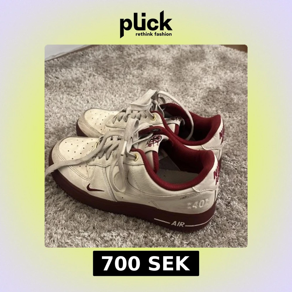 Säljer ett par Nike Air Force 1 med vit ovandel och vinröd sula samt detaljer. Skorna har klassisk Nike-logga på sidan, röd insida och texten NIKE AIR broderad bak. Perfekta för dig som gillar retrostil och streetwear.