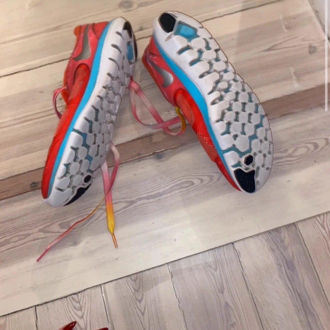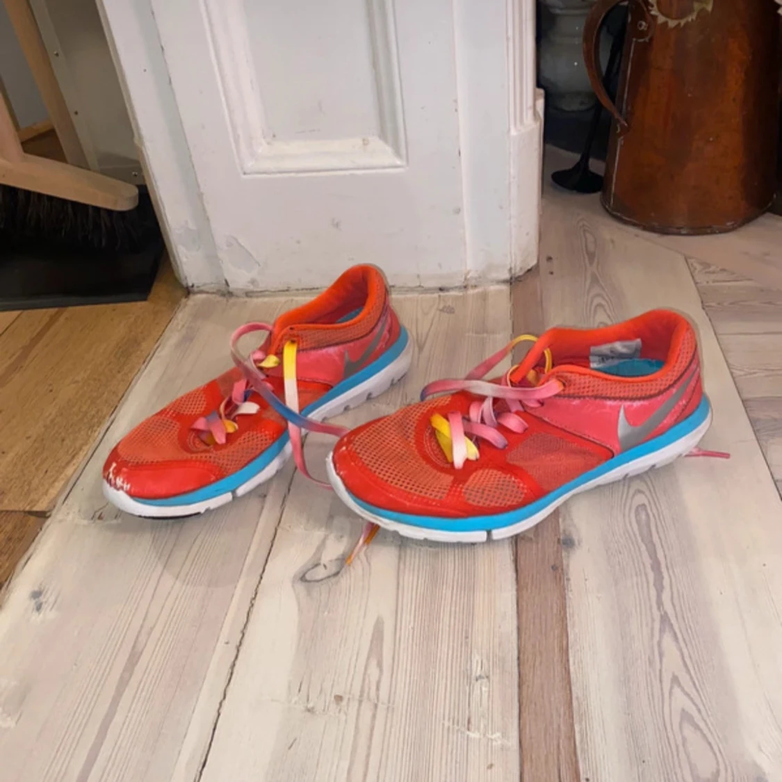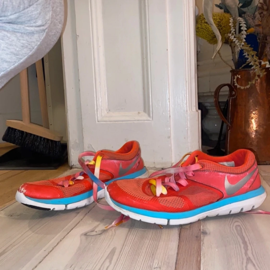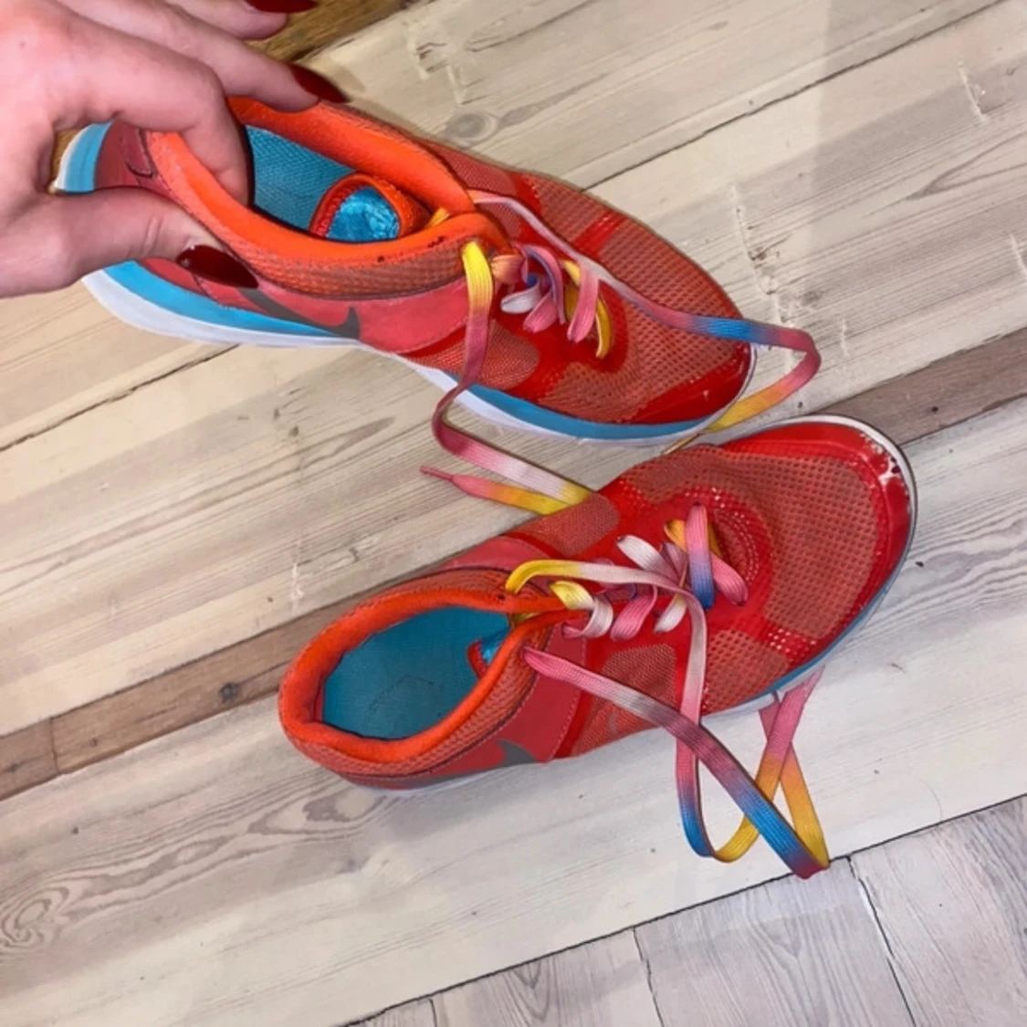 Säljer ett par röda Nike sneakers med färgglada snören och vit sula. Skorna har en luftig mesh-design och en tydlig Nike-logga på sidan. Perfekta för en färgglad och sportig stil.