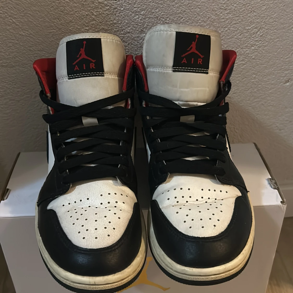 Säljer ett par klassiska Nike Air Jordans i svart, vitt och rött. Dom är välanvända och har inga större defter förutom veck framme på skorna som man ser på bild 4. Säljer p.g.a att jag inte använder dom längre. Skorna är i storlek 39. Orginal lådan följer med!🤗💕