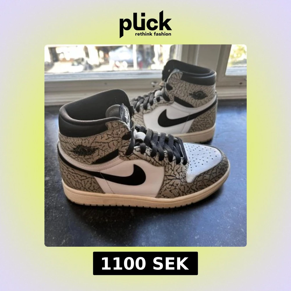 Säljer ett par Nike Air Jordan 1 High med ikoniskt elephant print i grått och svart, vita paneler och svarta detaljer. Skorna har svart swoosh, svarta skosnören och klassisk hög siluett. Ovandelen är i skinn och mönstret ger en riktigt unik vibe. Vita snören medföljes även.