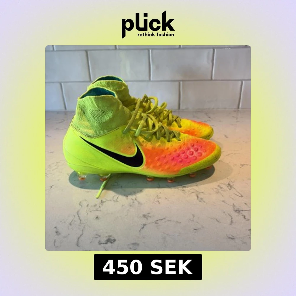 Säljer ett par Nike Magista fotbollsskor i en cool kombination av neonorange och neongul. Skorna har snörning och en hög ankelkrage för extra stöd. Perfekta för att dominera på planen med stil!