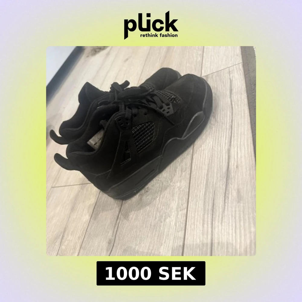 Säljer ett par helsvarta Nike Air Jordan 4 sneakers med klassisk meshpanel och coola detaljer. Skorna har snörning, rund tå och en chunky sula. Ovandelen är i mocka och syntet, vilket ger en stilren och sportig vibe. Perfekta för dig som gillar streetwear och vill sticka ut. Storlek 39