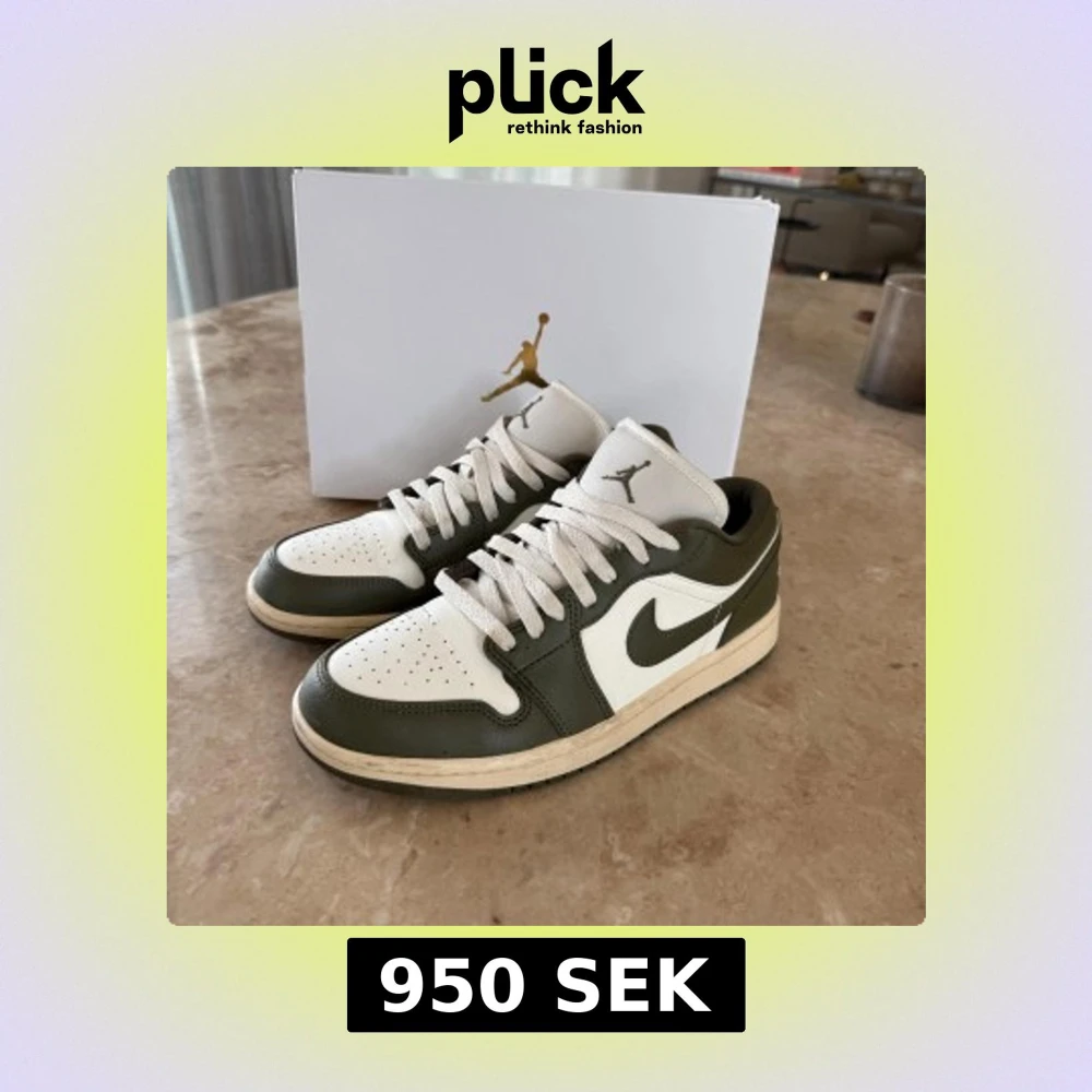 Säljer ett par Nike Air Jordan 1 Low i olivgrönt och vitt. Helt nya och använda endast 2-3 gånger.
