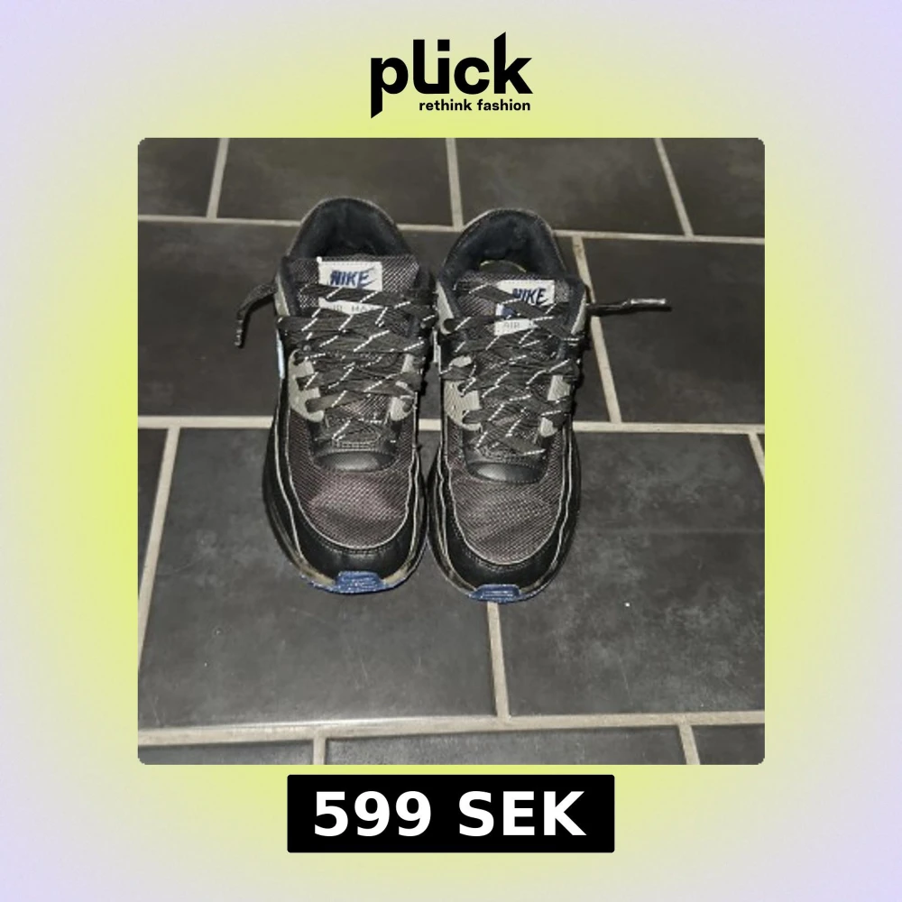 Säljer ett par Nike Air Max 90 sneakers i svart med blå och grå detaljer samt vit swoosh. Skorna har snörning, platt sula och är tillverkade i en mix av syntet och mesh för en sportig look. Perfekta för dig som vill ha en fet drip.