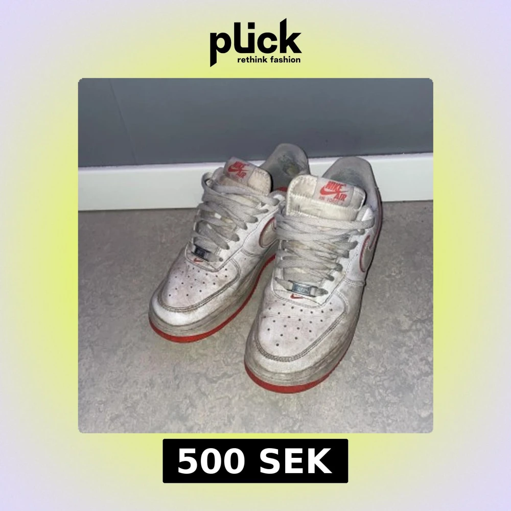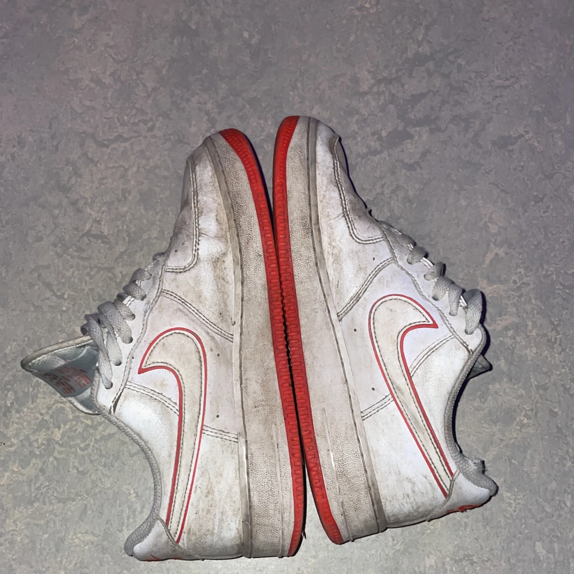 Säljer ett par klassiska Nike Air Force sneakers i vitt med röda detaljer. Skorna har en röd sula och snörning framtill. Perfekta för en sportig look.
