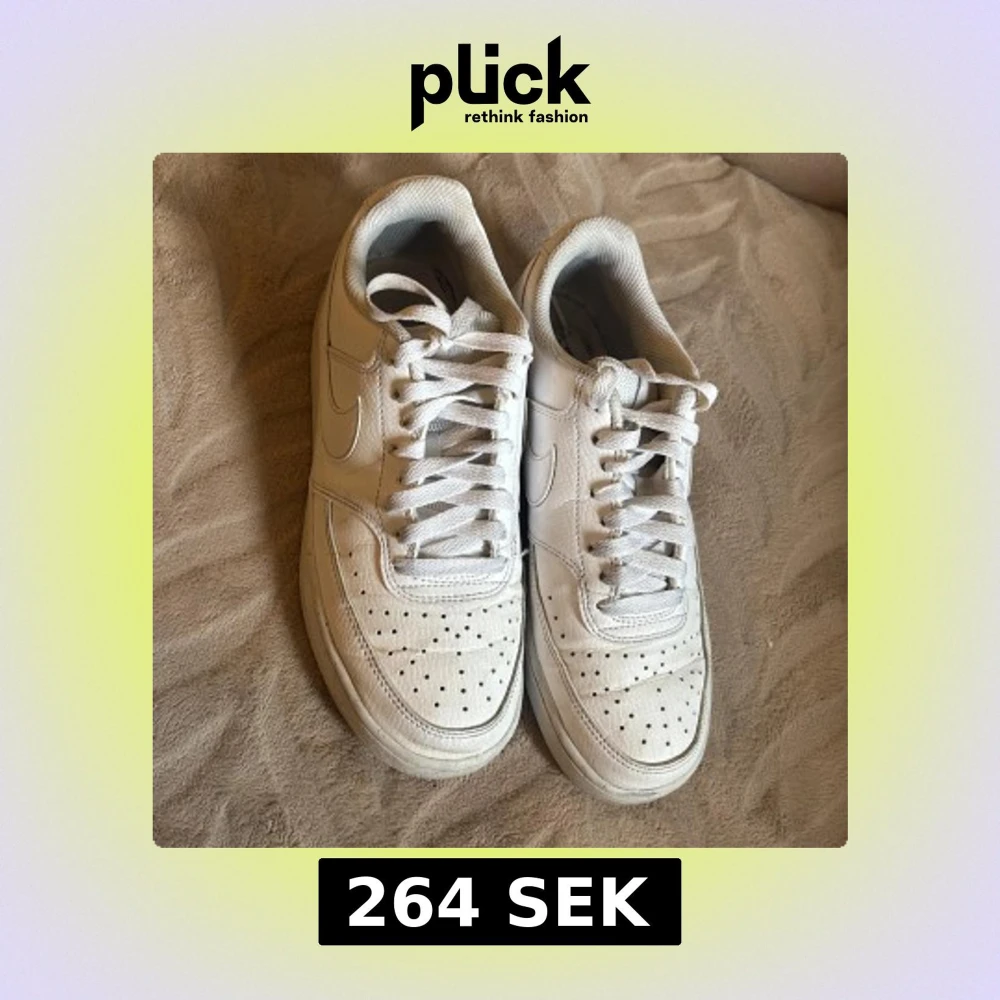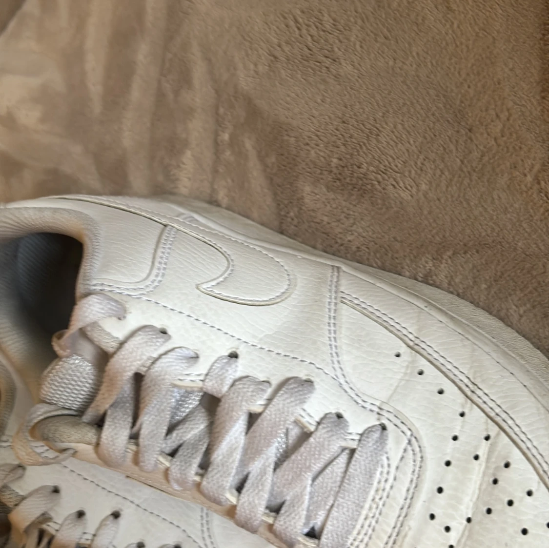 Klassiska Nike Air Force 1 sneakers i helvitt skinn med perforerad tå och rund tå. Skorna har snörning och den ikoniska swoosh-loggan på sidorna. Perfekt för dig som gillar en clean och tidlös stil.