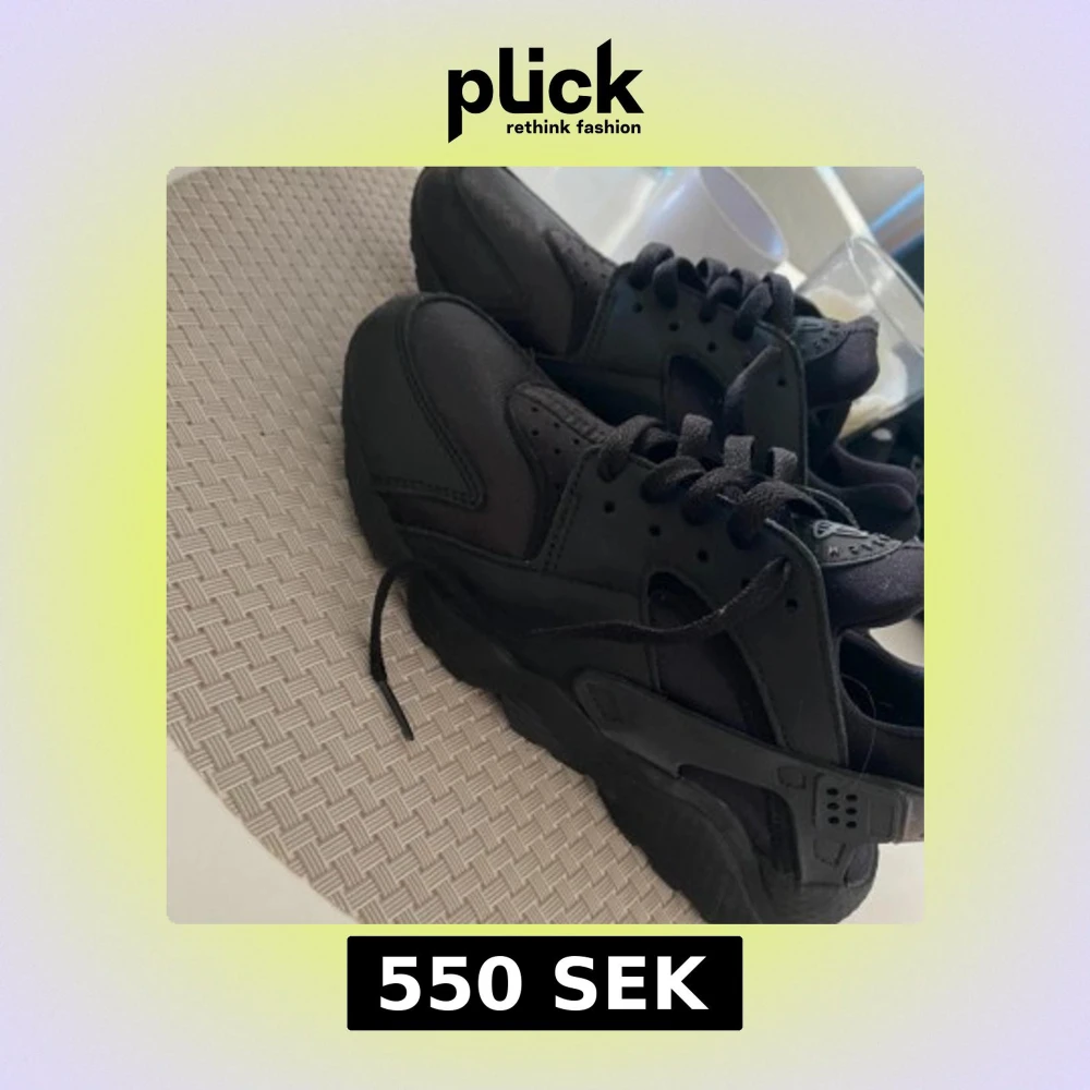 Säljer ett par helsvarta Nike Huarache sneakers med klassisk chunky sula och snygga detaljer i både textil och syntet. Skorna har snörning och rund tå, samt den ikoniska Huarache-loggan på plösen och bakre hälremmen. Dem är använda 2 gånger så i ett bra skick!