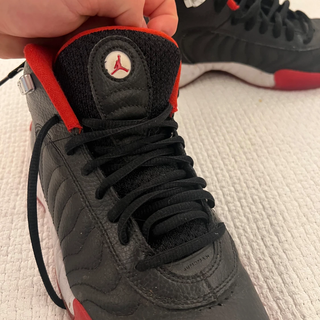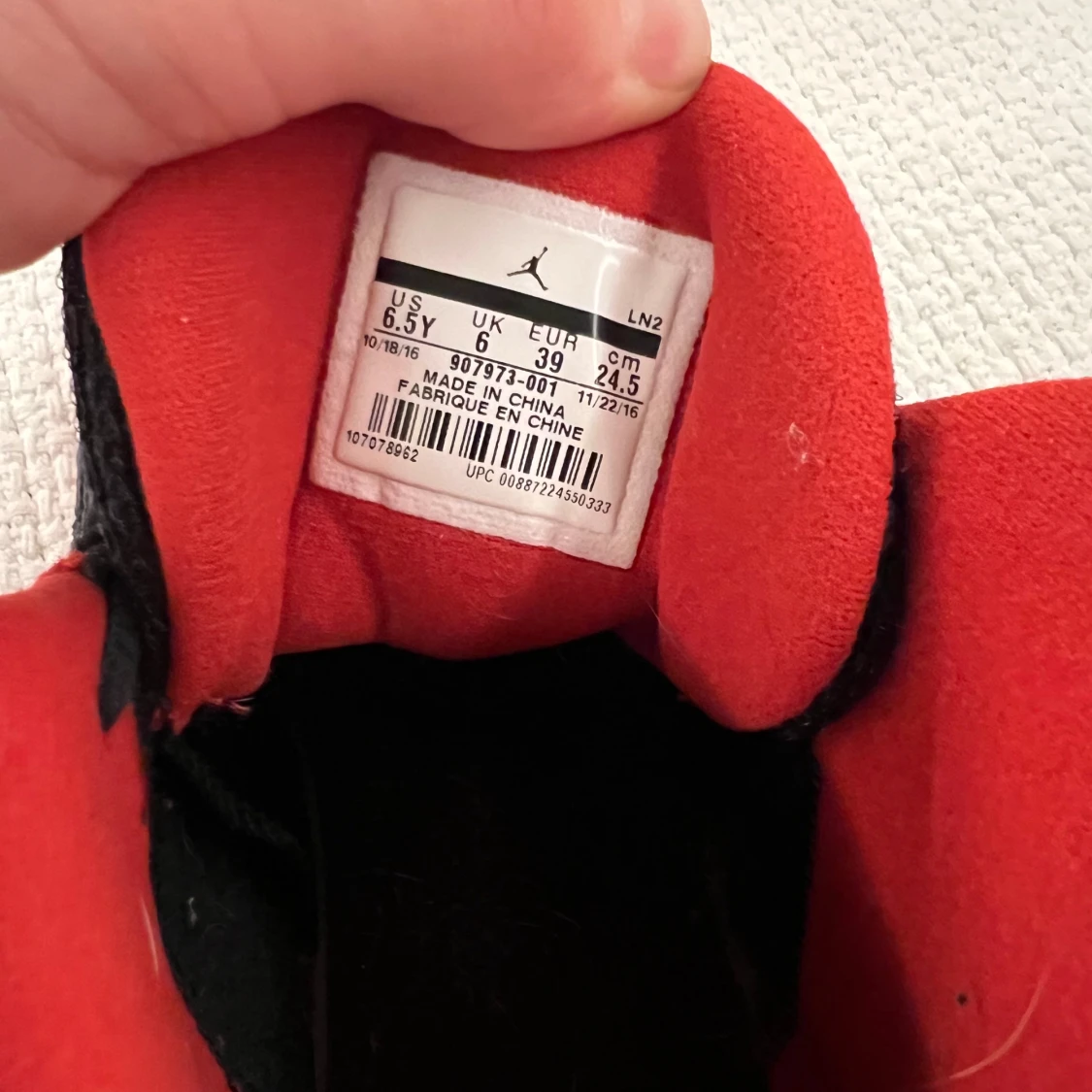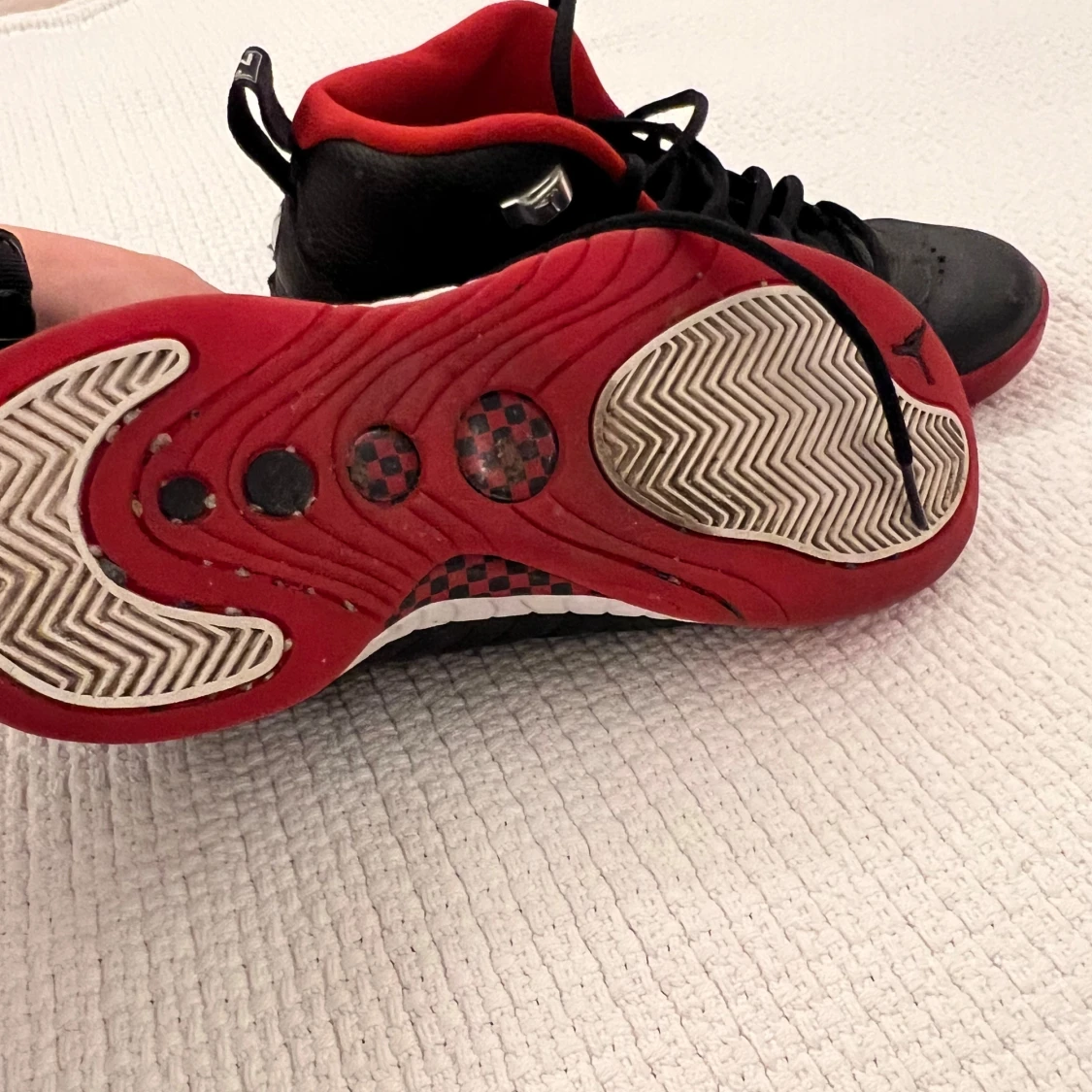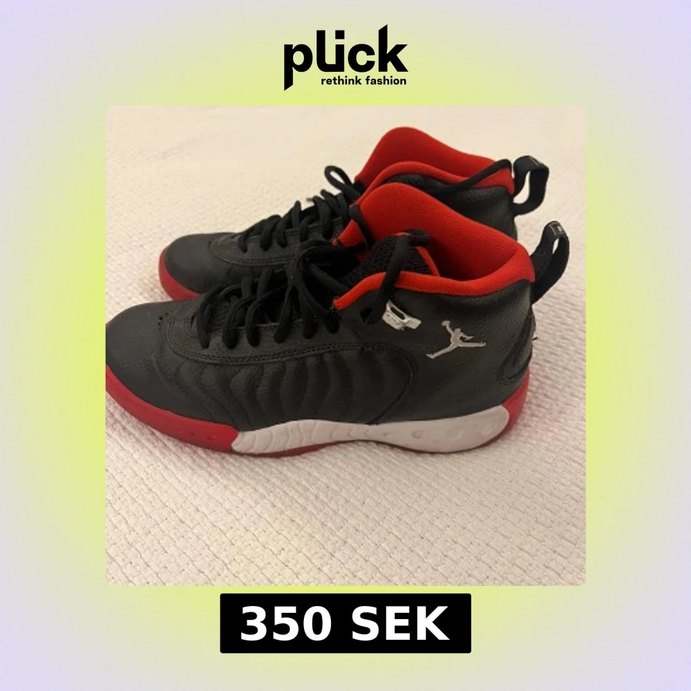 Snygga svarta Nike Air Jordan sneakers med röda och vita detaljer. Skorna har klassisk Jumpman-logga, svart snörning och röd insida. Ovandelen är i skinn och sulan har coolt mönster i rött, vitt och svart. Perfekta för dig som vill sticka ut med en ikonisk streetstil.