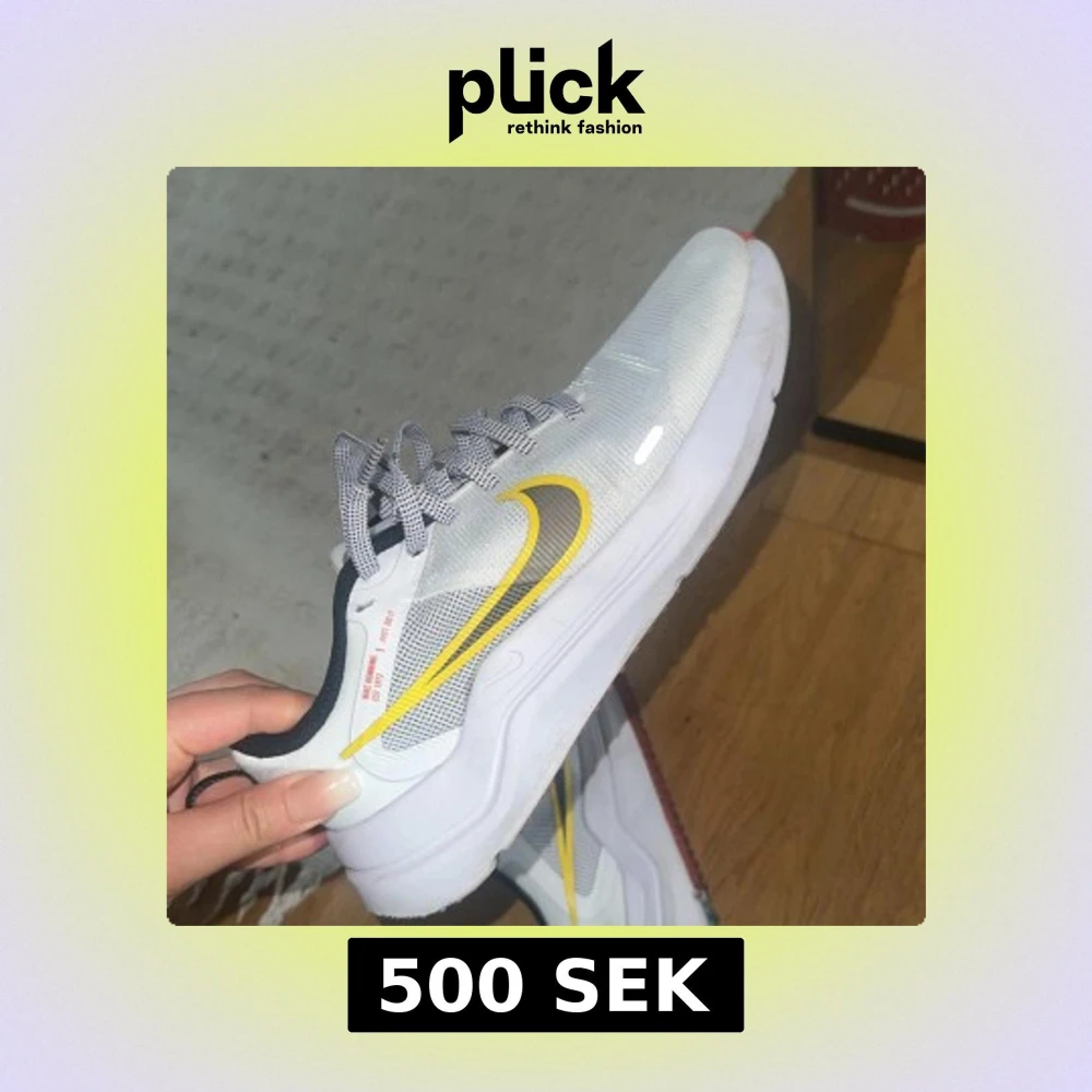 Nike sneakers i vitt med gråsvarta detaljer och en stor gul swoosh på sidan. Skorna har snörning, meshpaneler för andningsförmåga och en sula med röd och blå undersida. Perfekta för dig som gillar sportig och fräsch stil.