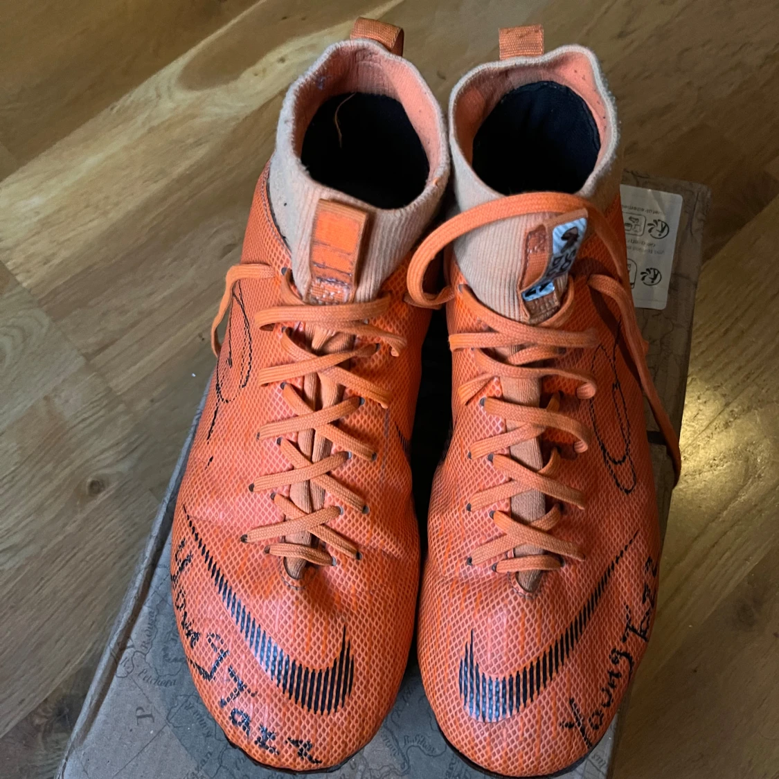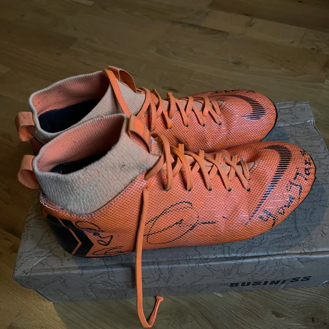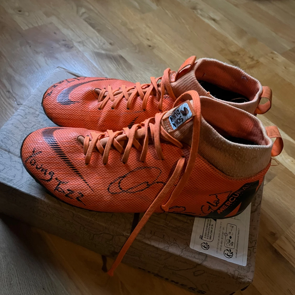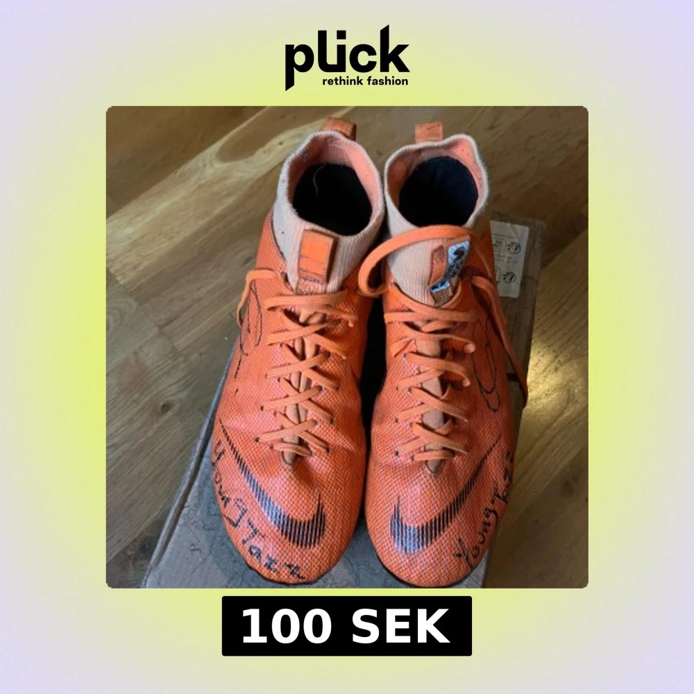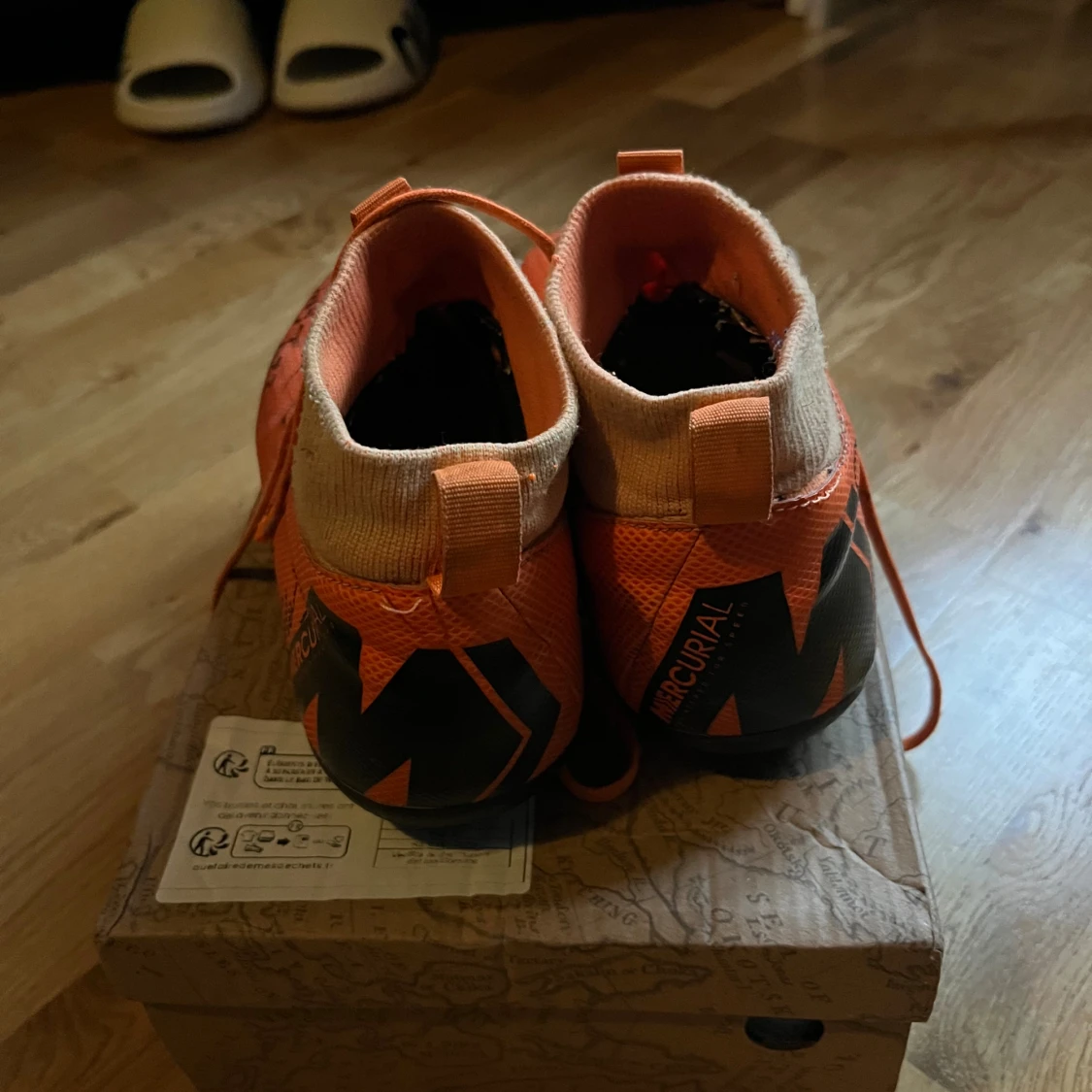 Säljer ett par grymma Nike Mercurial fotbollsskor i orange med svarta detaljer och snörning. Skorna har högre strumpliknande skaft för extra stöd och är tillverkade i syntetmaterial. Perfekta för dig som vill sticka ut på planen!