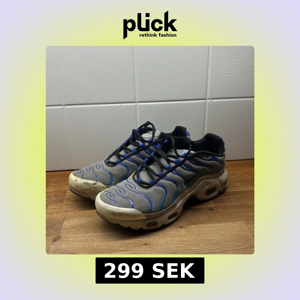 Nike Air Max Plus sneakers i grå mesh med blå och svarta detaljer. Skorna har svarta snören, svarta och blå vågformade linjer på ovandelen och en vit, chunky sula med synliga luftbubblor. Swoosh-logga på sidan och svart innersula. Perfekta för dig som gillar sportig och retro stil.