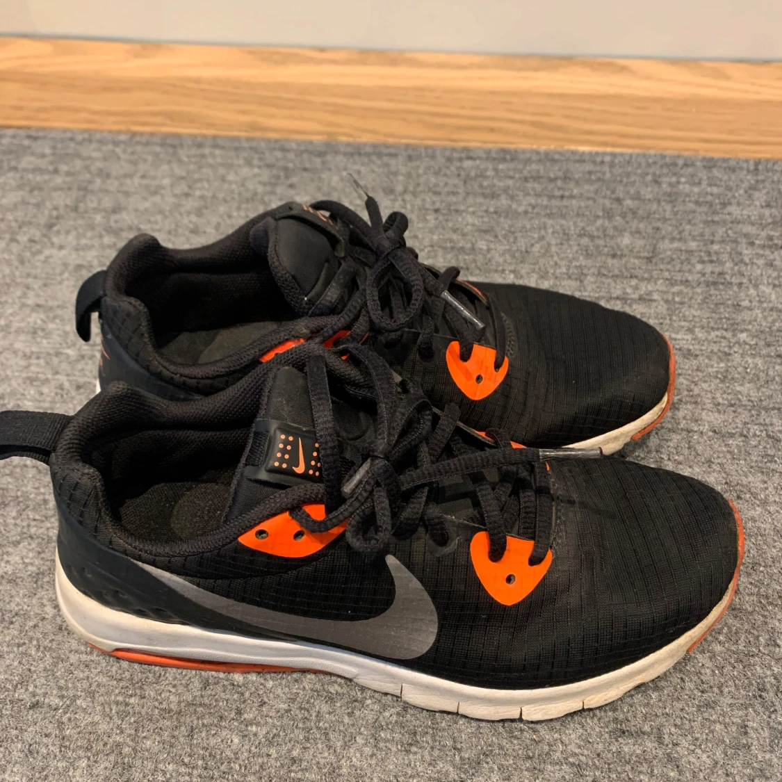 Säljer ett par svarta Nike sneakers med orange detaljer och vit sula. Skorna har en stor silverfärgad swoosh på sidan och svarta skosnören. Perfekta för träning eller vardag, med bekväm passform och sportig look.
