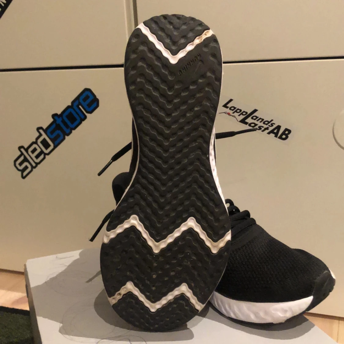 Snygga svarta Nike sneakers med vit sula och klassisk vit swoosh-logga. Skorna har snörning och en bekväm passform, perfekta för vardagsbruk eller träning.