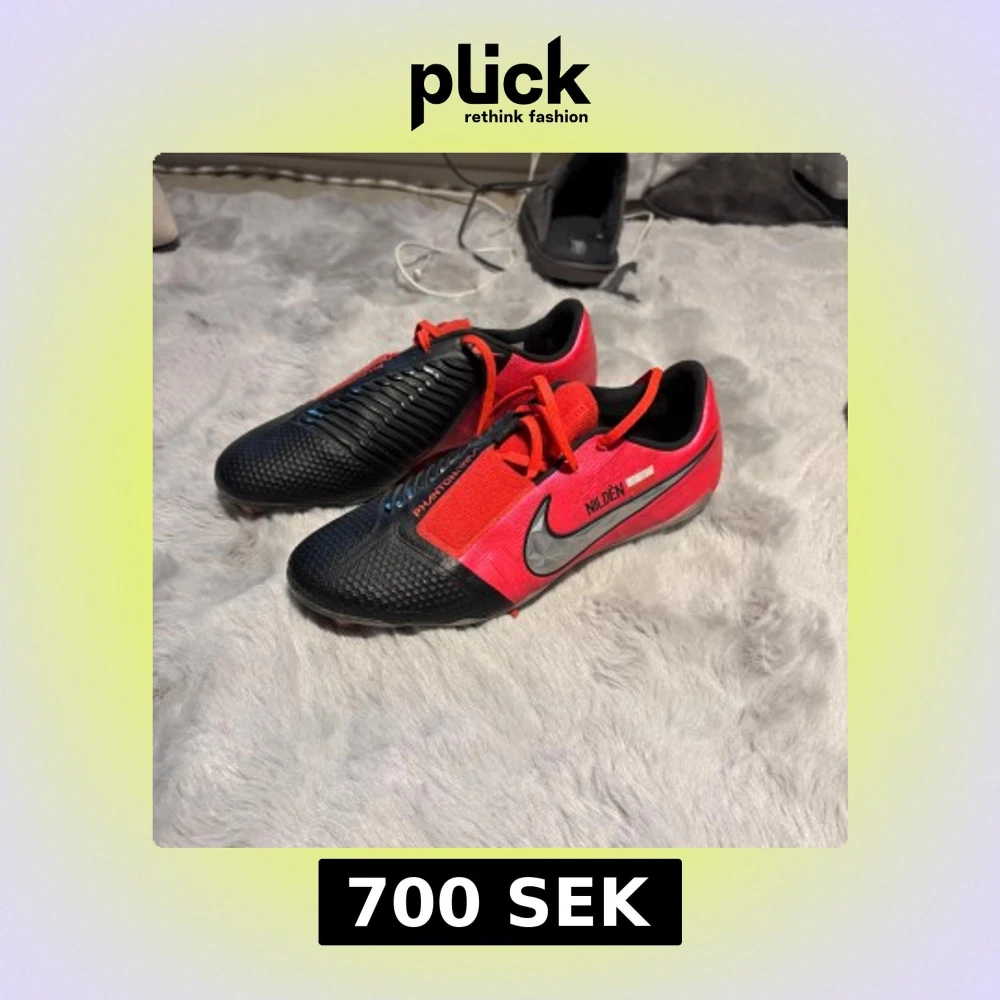 Säljer ett par Nike Phantom Vision fotbollsskor i svart och rött med silverfärgad swoosh. Skorna har snörning, texturerad ovandel för bättre bollkontroll och en smal, sportig siluett. Perfekta för dig som vill sticka ut på planen. Namnen på skorna är borta