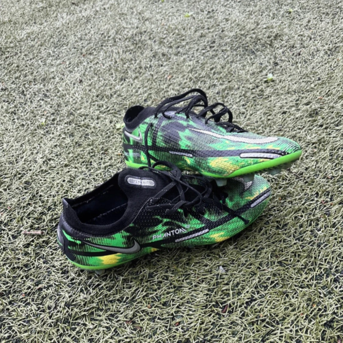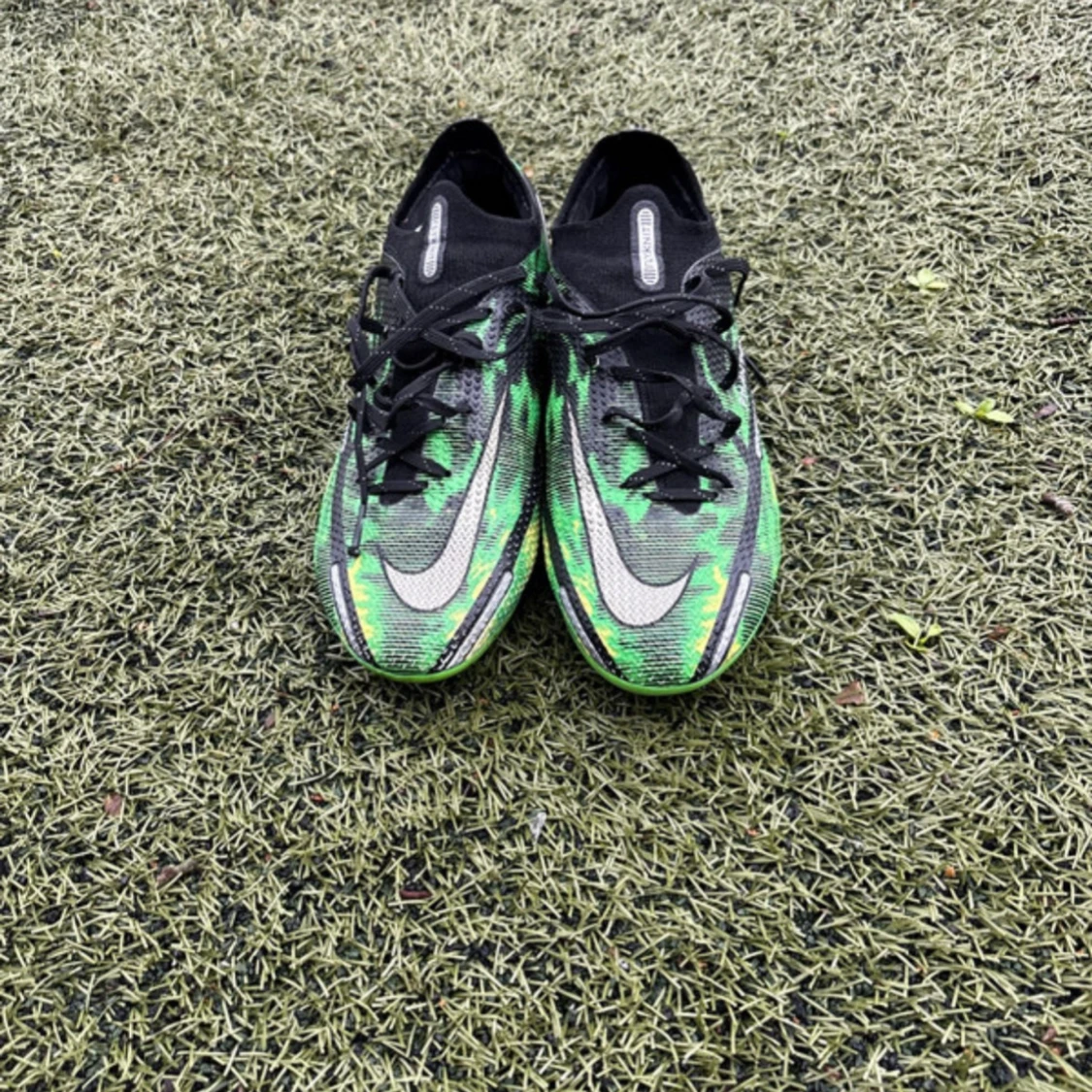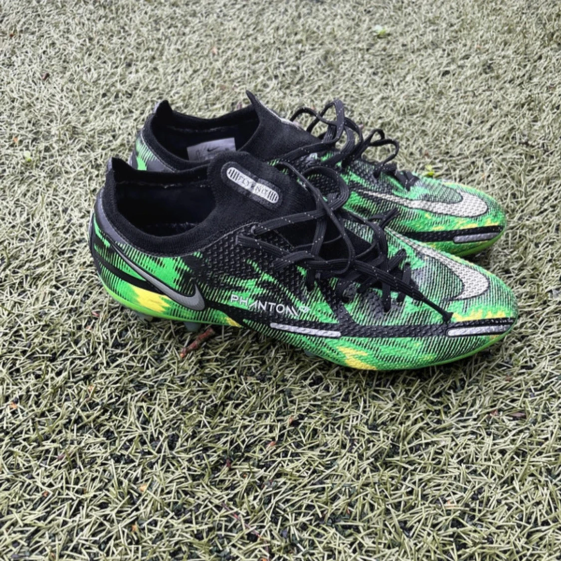 Säljer ett par Nike Phantom GT2 Elite fotbollsskor i svart och grönt med silverdetaljer.