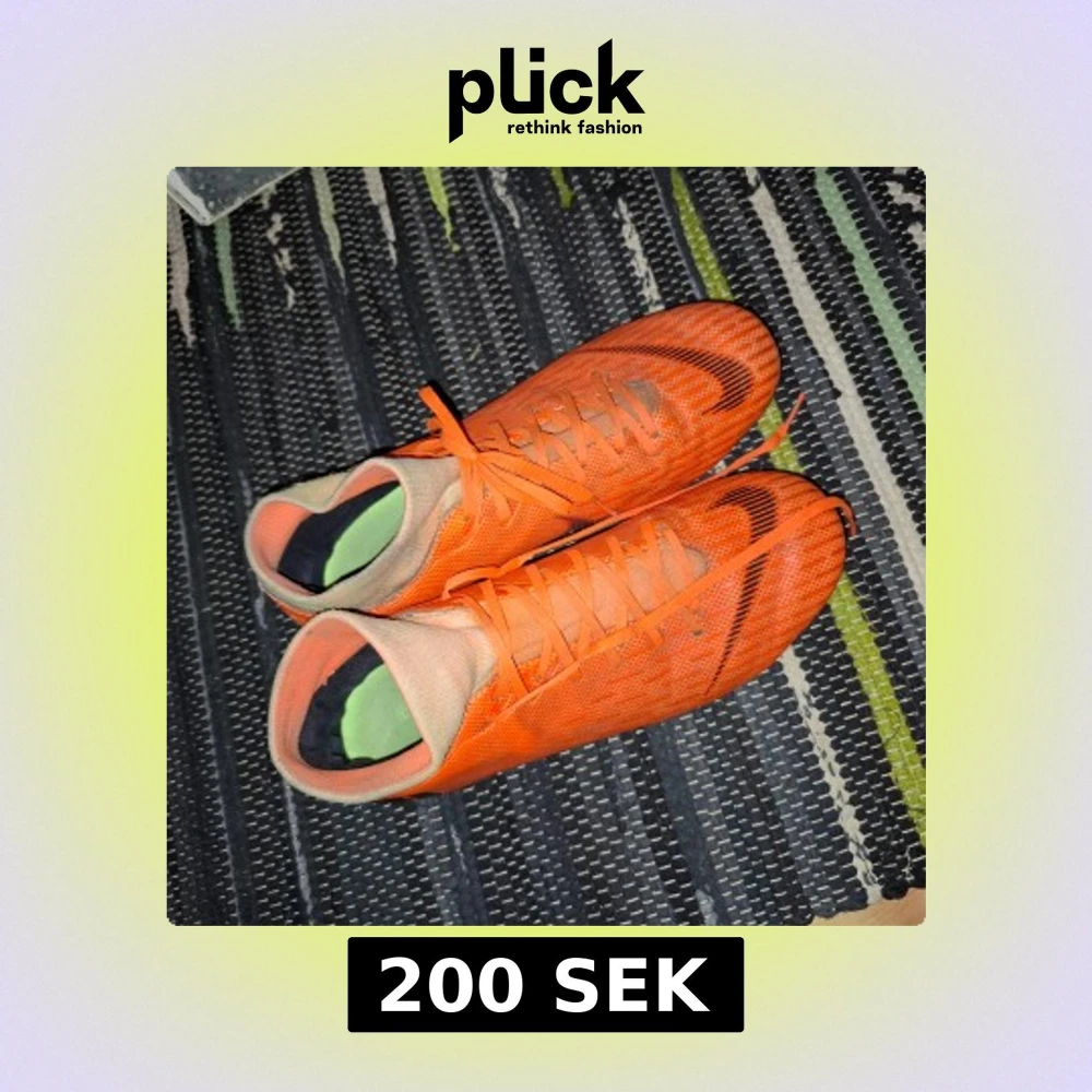 Säljer ett par orangea Nike fotbollsskor med svarta detaljer och snörning. Skorna har dobbar för spel på gräs och en smal, sportig design. Perfekta för dig som vill sticka ut på planen med stilrena och snabba skor.