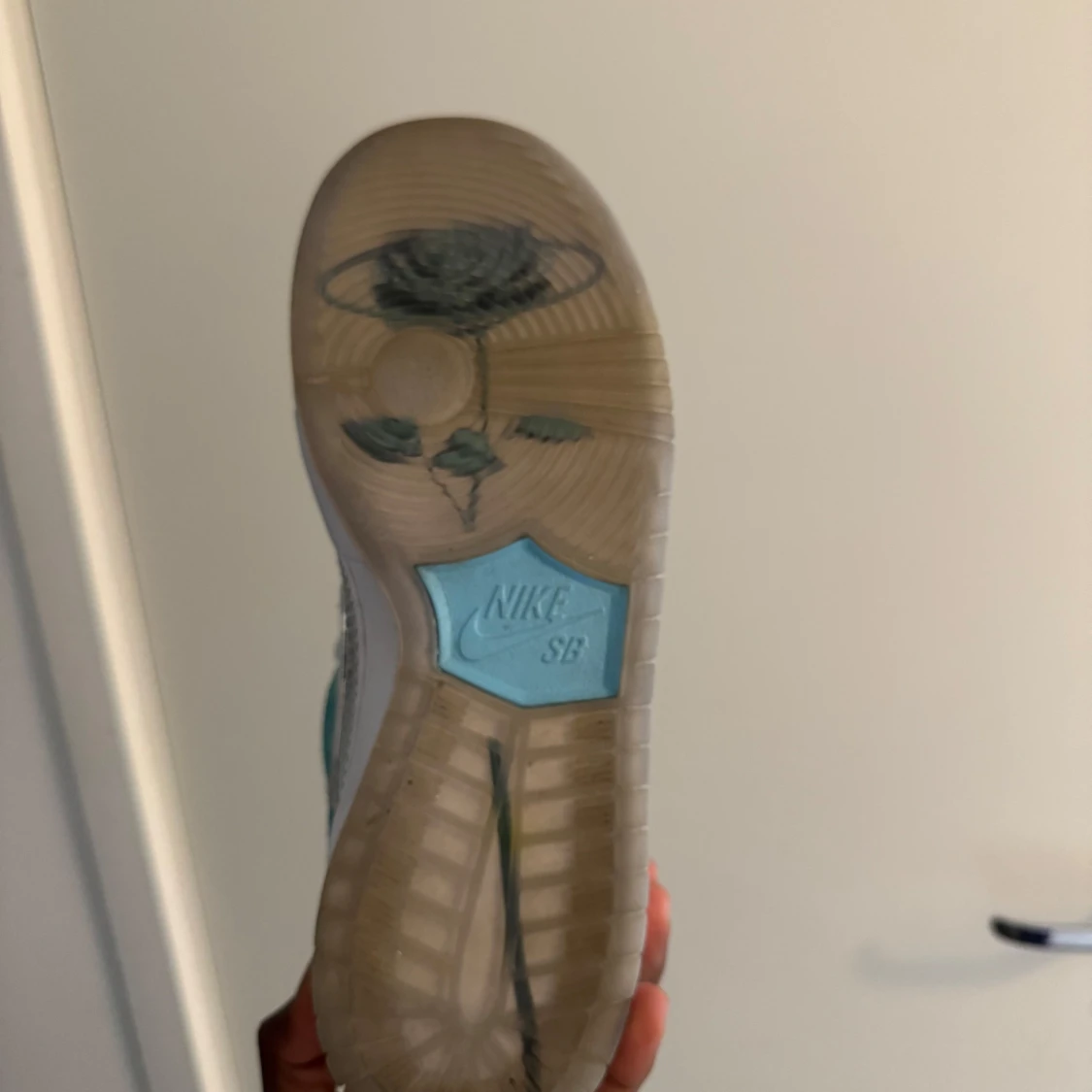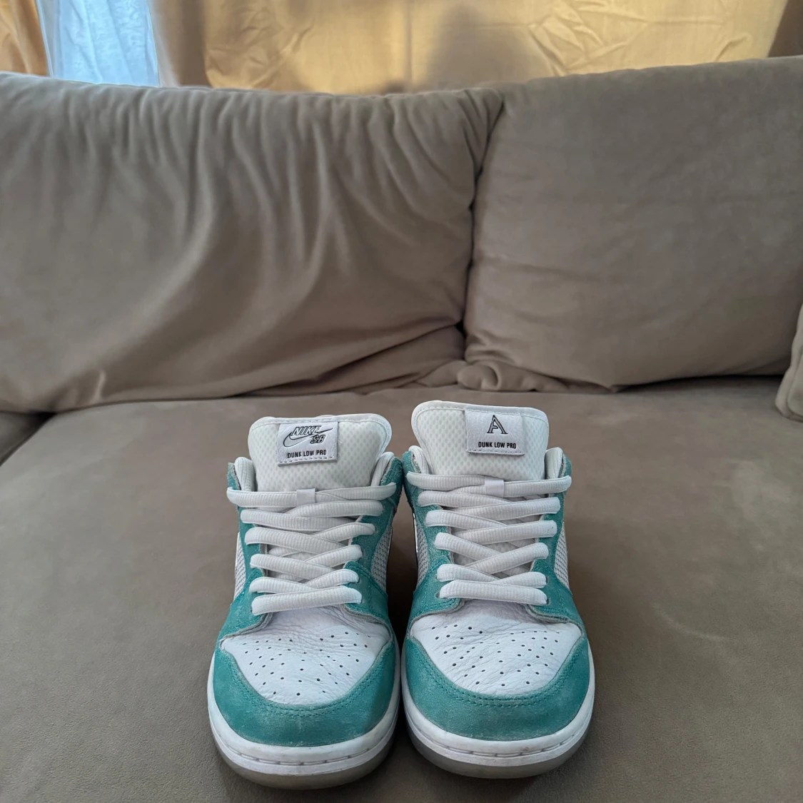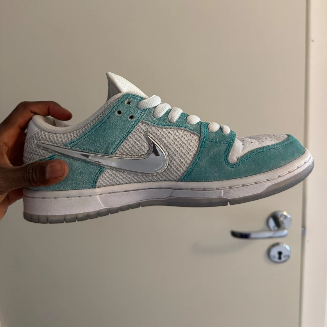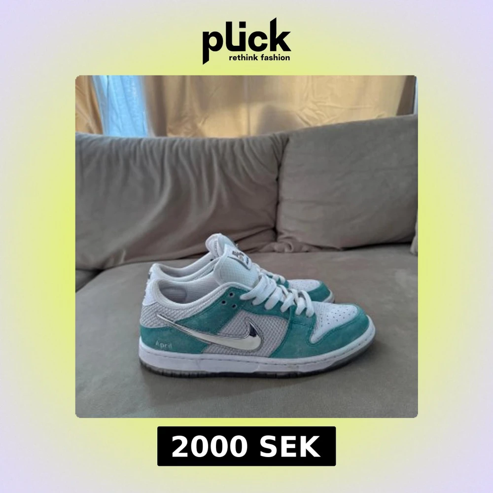 Nike SB Dunk Low Pro April Skateboards med vit mesh och turkosa mockadetaljer. Swoosh i metallic silver, broderad 'April' på hälen och rosdetalj under genomskinlig sula. Låga sneakers med snörning, perfekt för dig som gillar unika och snygga kicks. Knappt använt dom lika bra som nya