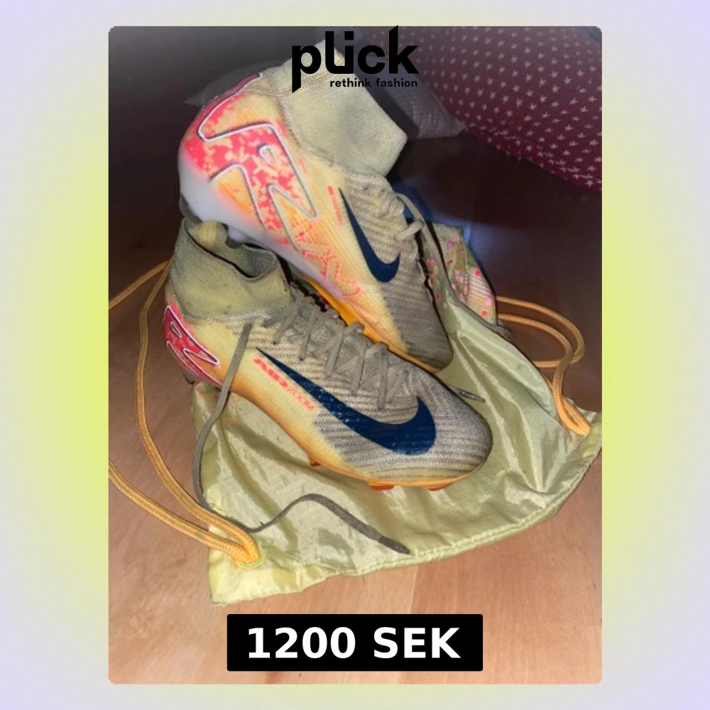 Säljer ett par Nike Zoom Mercurial elite fotbollsskor med högt skaft och snörning. Skorna är beige med inslag av orange, rosa och mörkblå detaljer, samt digitalt mönster på hälen. Sulan är orange med svarta och rosa detaljer. Medföljer original gympåse med KM-logga.
