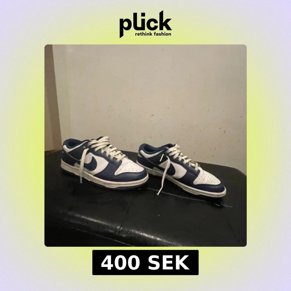 Säljer ett par Nike Dunk Low sneakers i blått och vitt skinn med klassisk swoosh på sidorna. Skorna har vit snörning, perforerad tåbox och blå yttersula. Har små defekter men allt smuts går bort om du tvättar dom! Har ingen anning om pris så det är bara att buda. Bara att fråga om du undrar nåt!