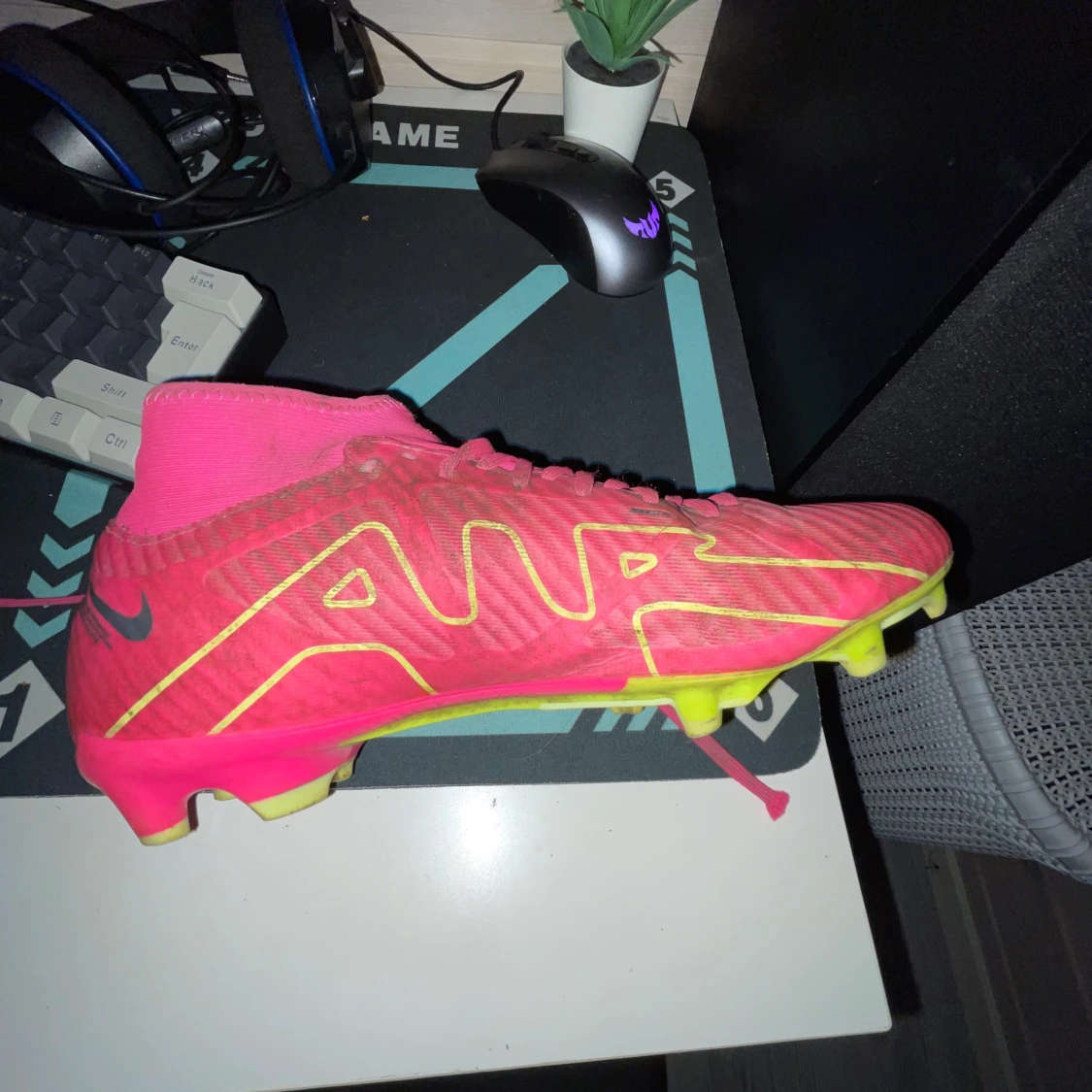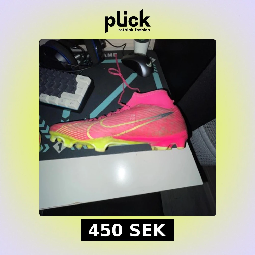 Säljer ett par Nike Air Zoom Mercurial fotbollsskor i en riktigt snygg rosa färg med gula detaljer och svart swoosh. Skorna har snörning, hög krage och platt sula med dobbar för gräsplan. Lätta och smidiga i syntetmaterial, perfekta för dig som vill sticka ut på planen.