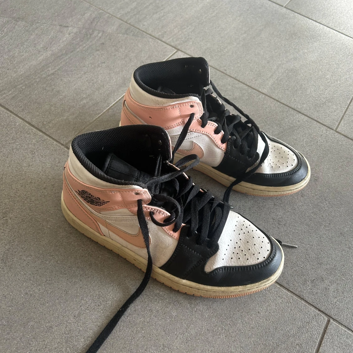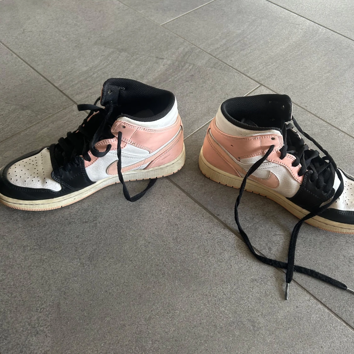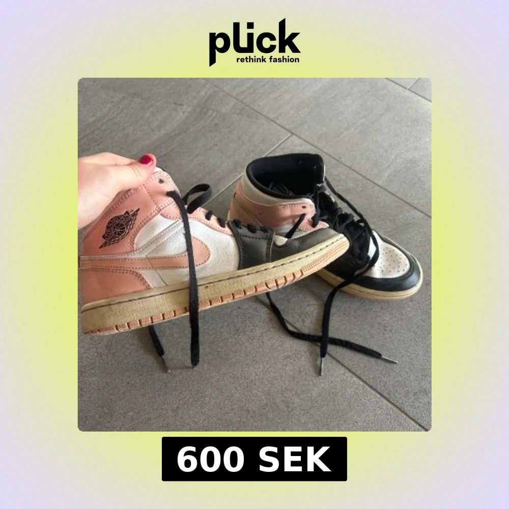 Snygga Nike Air Jordans i en unik färgkombination av rosa, svart och vitt. Skorna har klassisk snörning och en hög design som ger bra stöd. Ser nästa helt nya ut inga defekter❤️