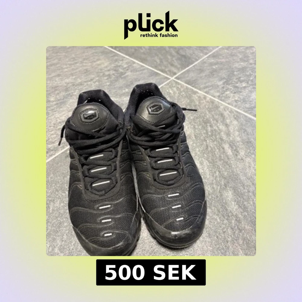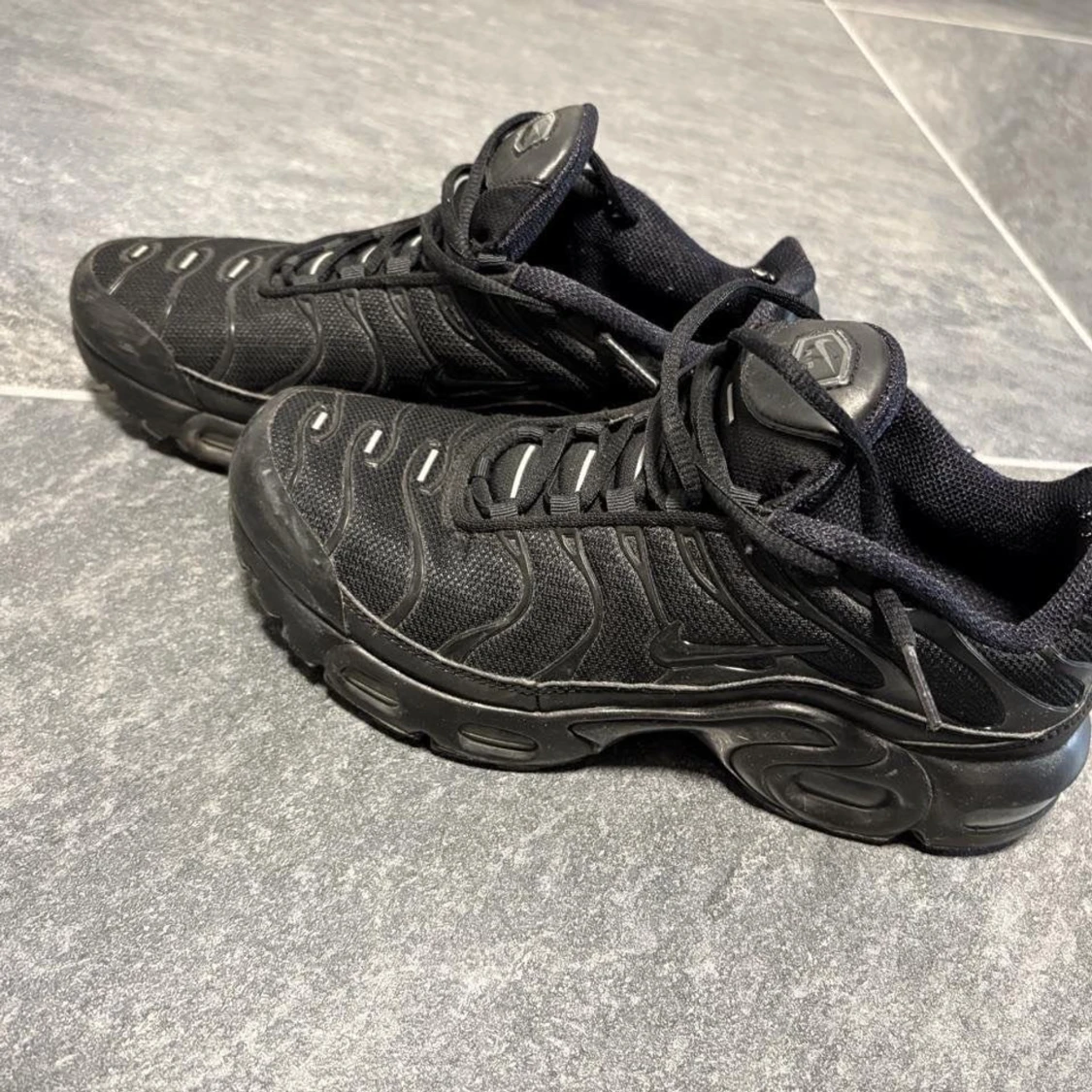 Säljer ett par helsvarta Nike Air Max sneakers med klassisk vågig design och synlig Air-sula. Skorna har snörning, mesh- och syntetmaterial samt diskreta reflekterande detaljer. Perfekta för dig som gillar streetwear och sportig stil.