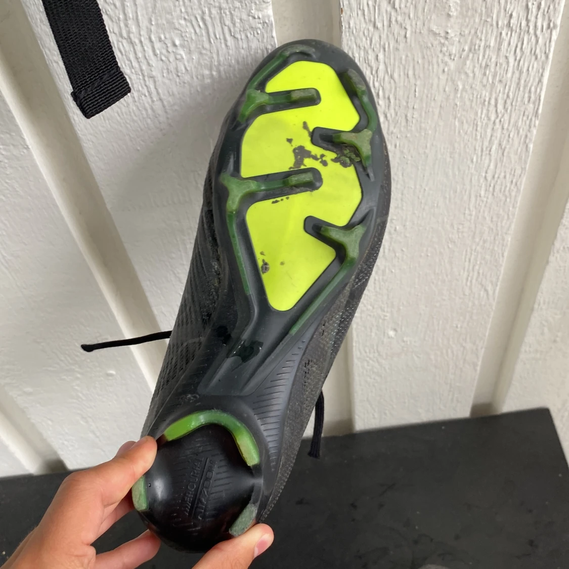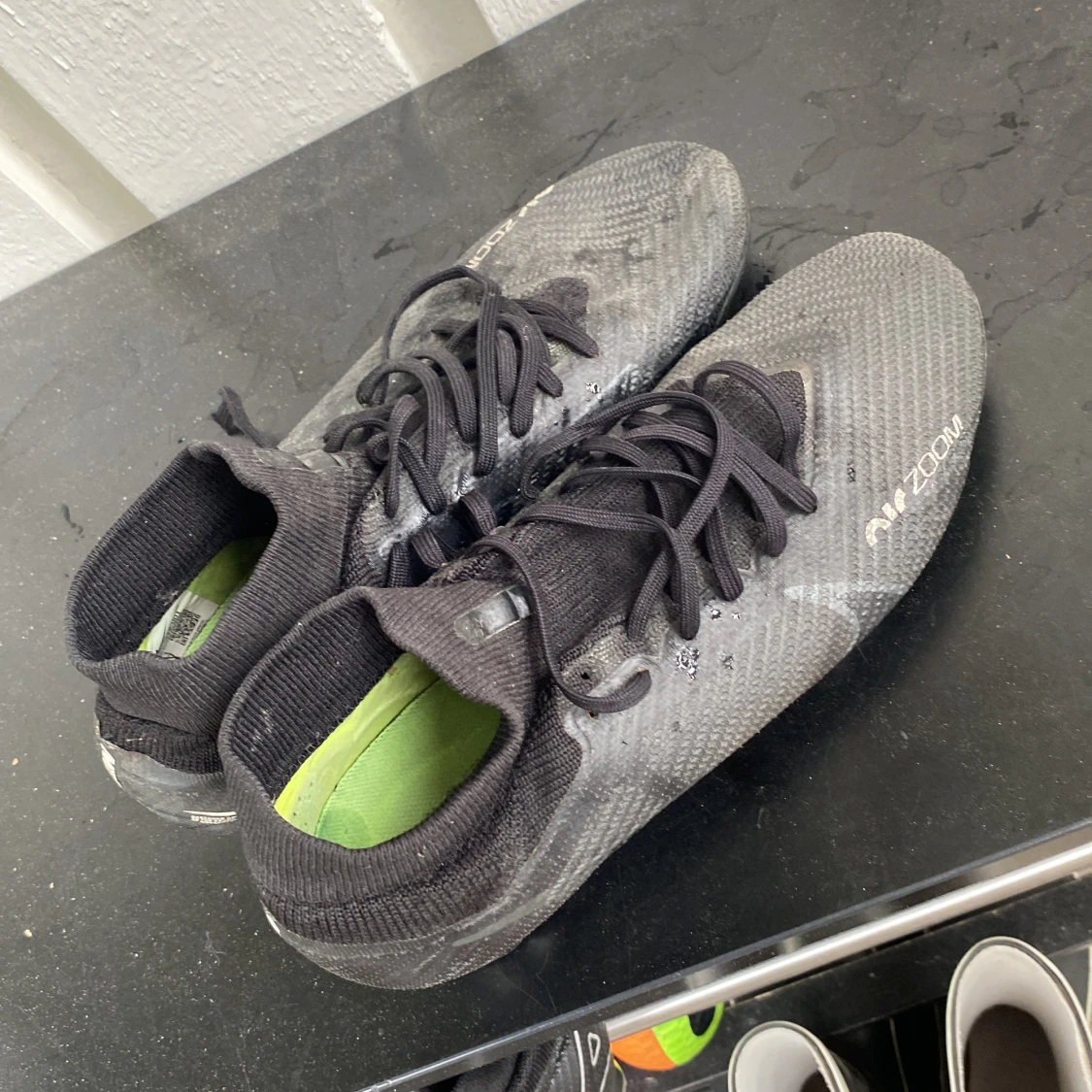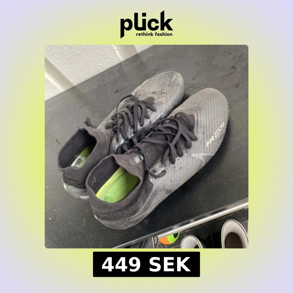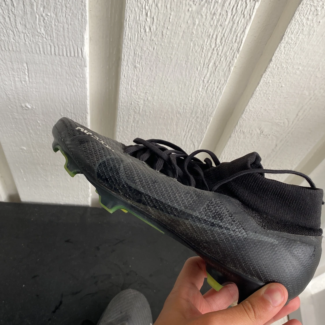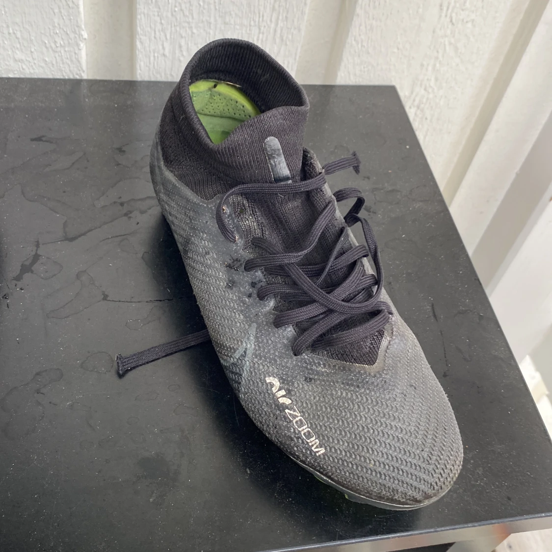 Svarta Nike Air Zoom fotbollsskor med stickad strumpliknande krage och snörning. Ovandelen är i syntetmaterial med diskret mönster och sulan har gröna detaljer undertill. Perfekta för dig som vill ha grymt grepp och lätt känsla på planen.