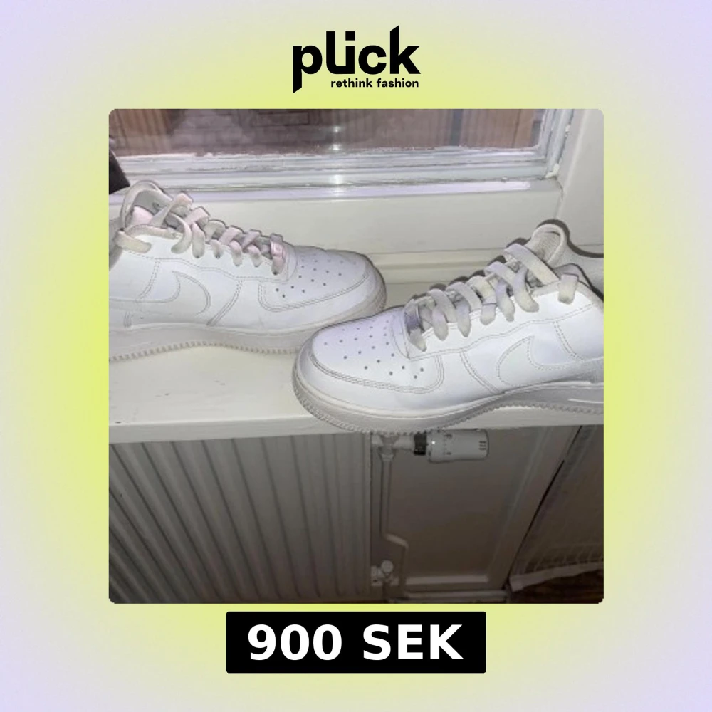 Säljer ett par klassiska vita Nike Air Force sneakers. De har en stilren design med snörning och den ikoniska swoosh-loggan på sidan. Perfekta för en casual look. Köpta för 1499kr på Nike.