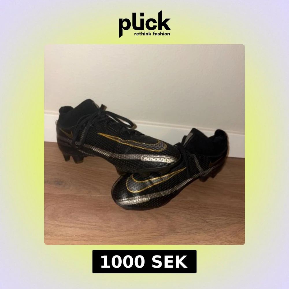 Nike Phantom GT fotbollsskor i svart med guld- och silverdetaljer. Skorna har snörning, platt sula med dobbar och en strumpliknande passform runt ankeln. Materialet är syntet med meshstruktur för extra grepp och kontroll. Säljes med originalpåse.