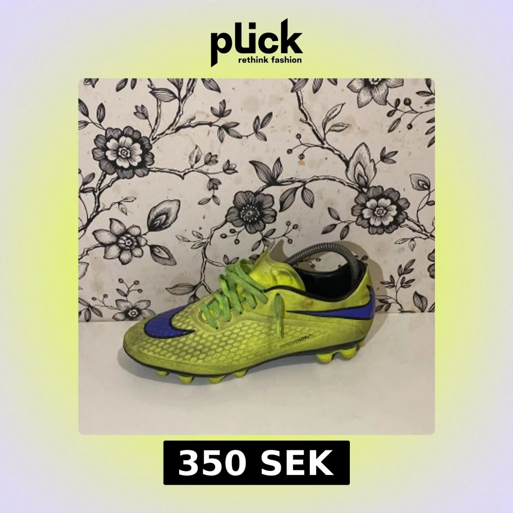 Säljer ett par coola gröna fotbollsskor från Nike med lila detaljer och snörning. Skorna har en unik design med en dödskalle på sidan och är perfekta för gräsplaner. De har en mönstrad yta för bättre grepp och kontroll.