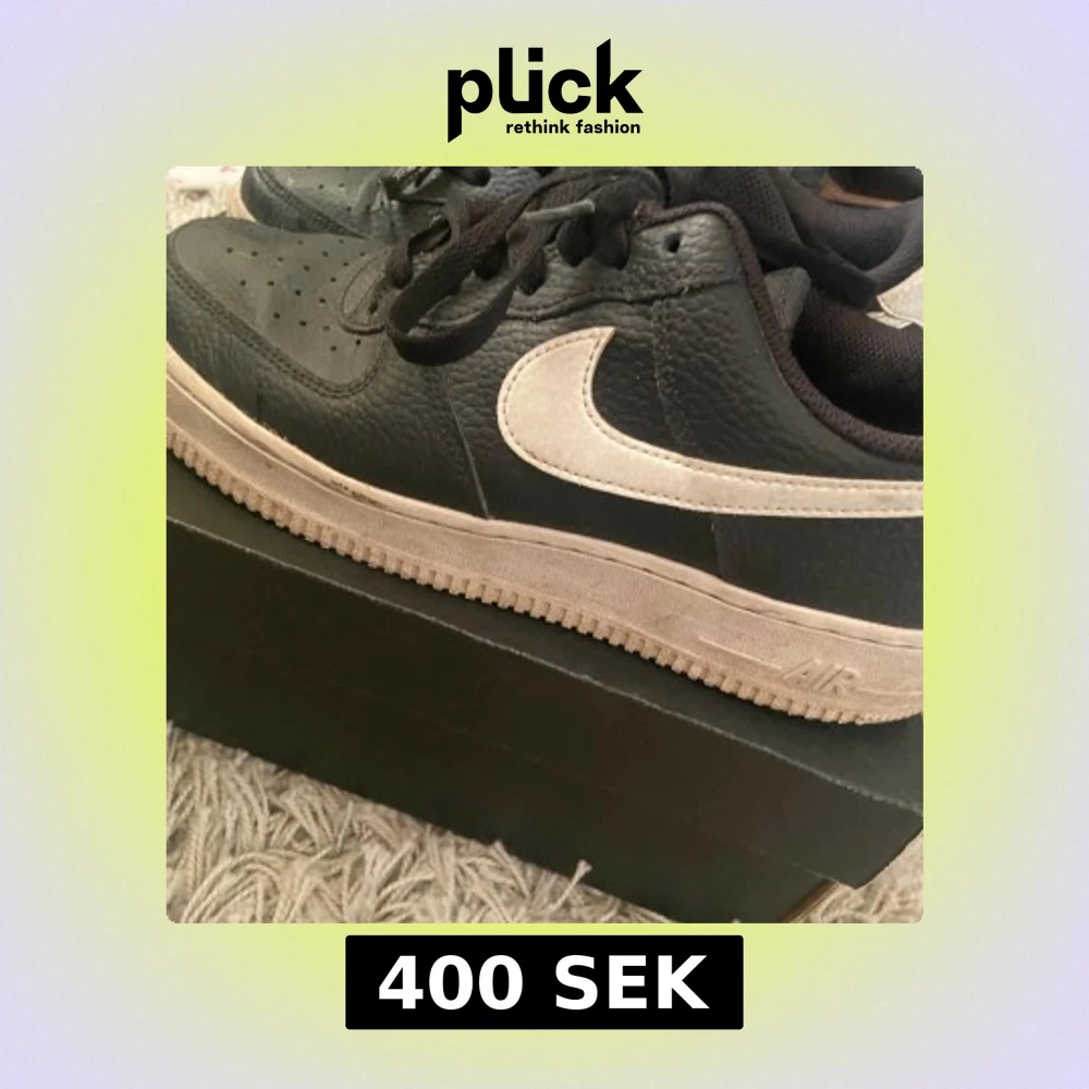 Klassiska svarta Nike Air Force 1 sneakers med vit sula och vit swoosh på sidan. Skorna har snörning och är tillverkade i skinn med en rund tå och platt sula. Perfekta för dig som gillar en tidlös streetstil.