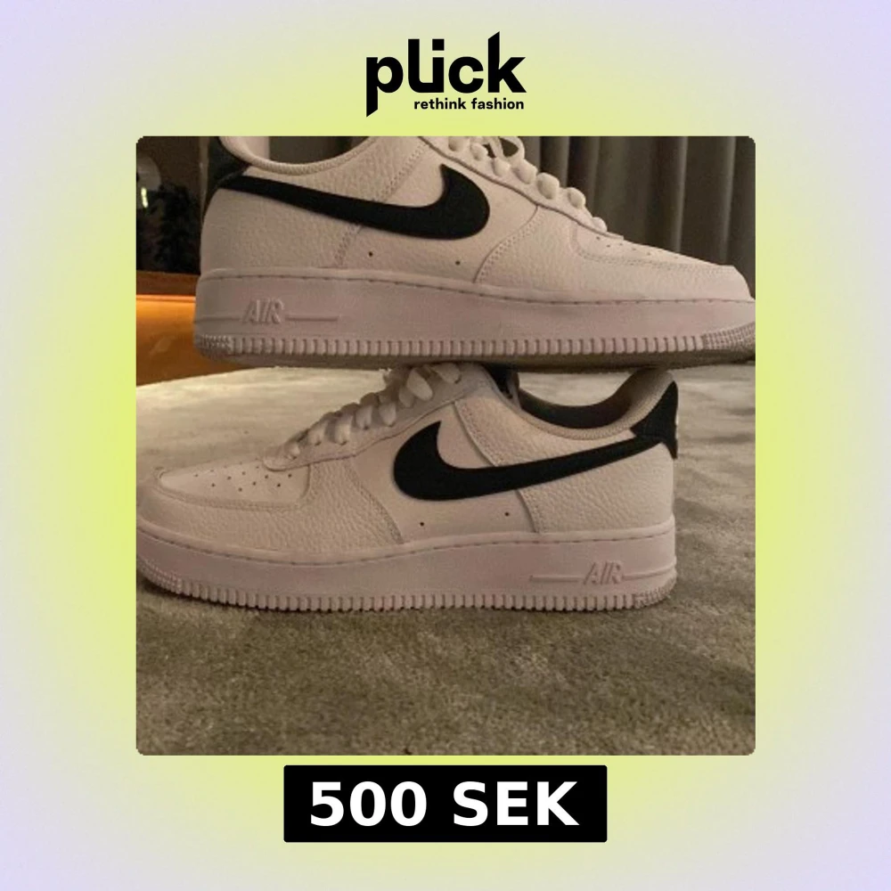 Säljer ett par klassiska Nike Air Force 1 sneakers i vitt med svart swoosh. Skorna har en robust sula och snörning framtill. Perfekta för en stilren look OBS dom är helt nya