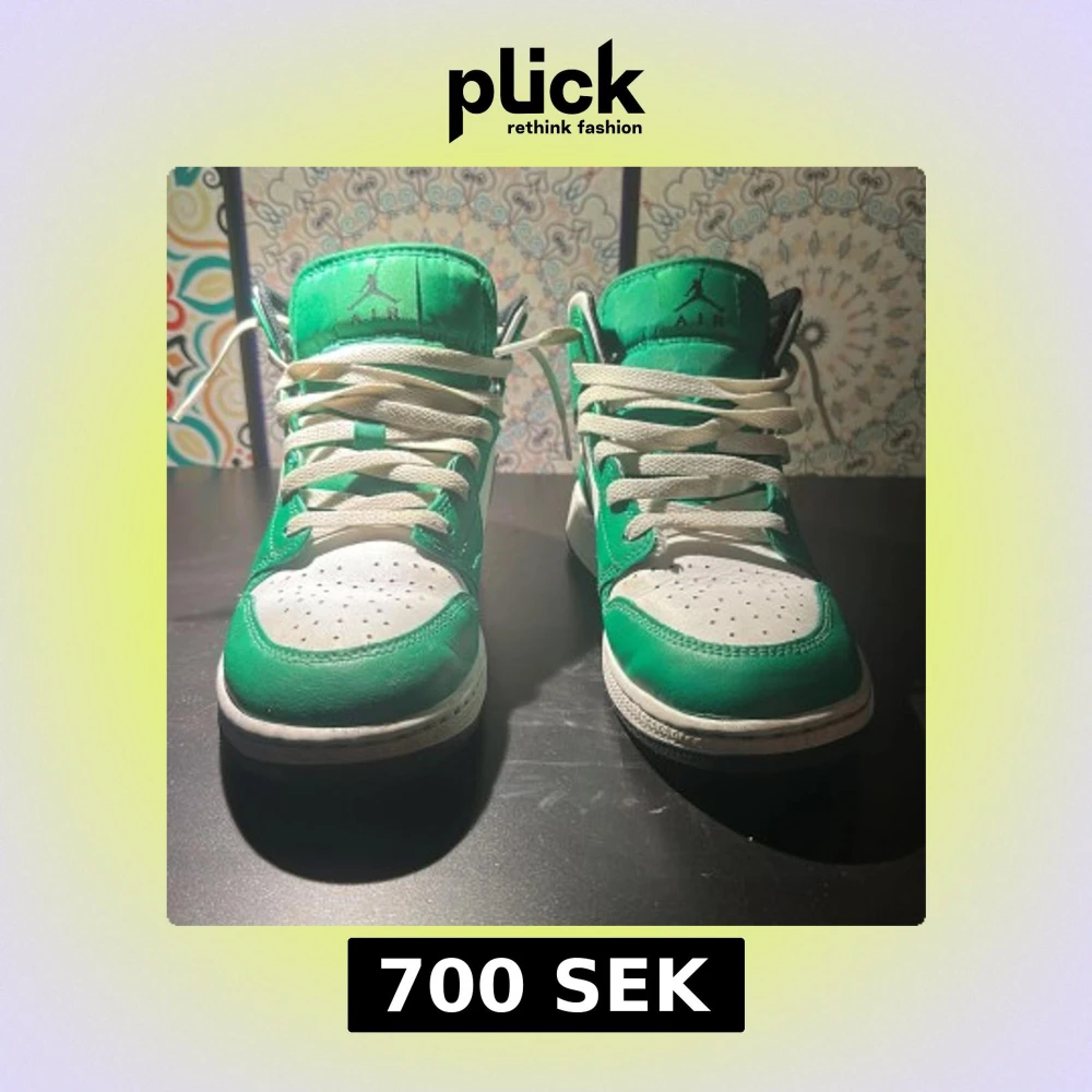 Säljer ett par Nike Air Jordan 1 Mid i fräscha gröna och vita färger. Skorna har klassisk snörning, vit sula och svart innerfoder. Ikonisk Jordan-logga på sidan och tungan. Perfekta för dig som vill sticka ut med stilrena sneakers. Pytte lite creasade