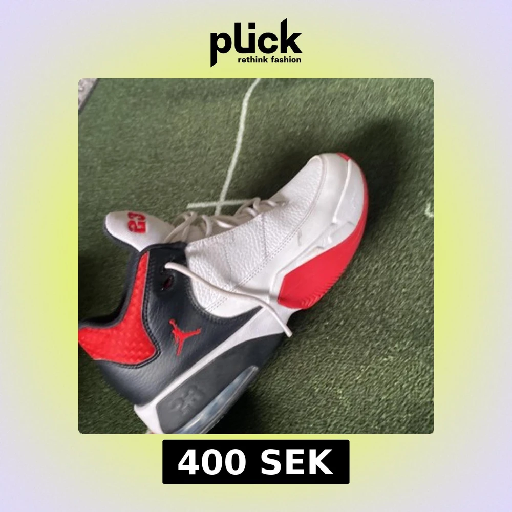 Snygga Nike Air Jordan sneakers i vitt, svart och rött med klassisk Jumpman-logga och siffran 23 på plösen. Skorna har snörning, platt sula och är tillverkade i skinn med detaljer i syntet. Perfekta för dig som gillar streetstyle och basketinspirerad look.