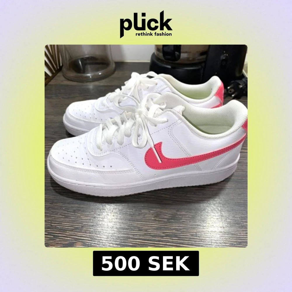 Säljer ett par fräscha vita Nike sneakers med rosa swoosh och häl. Skorna har klassisk design med snörning, perforerad tå och platt sula. Perfekta för dig som gillar sportig och stilren look. Använt endast 1 gång.