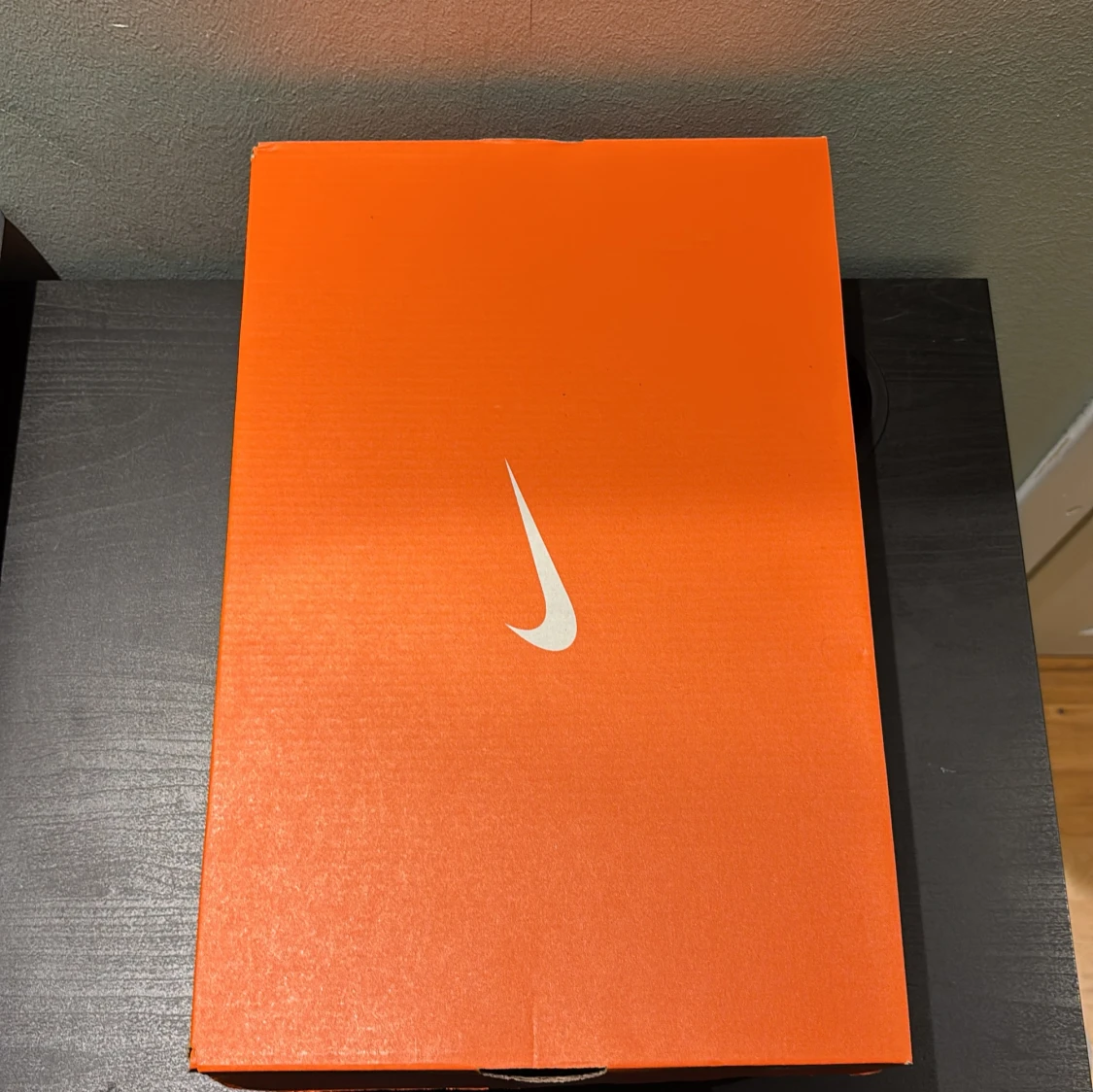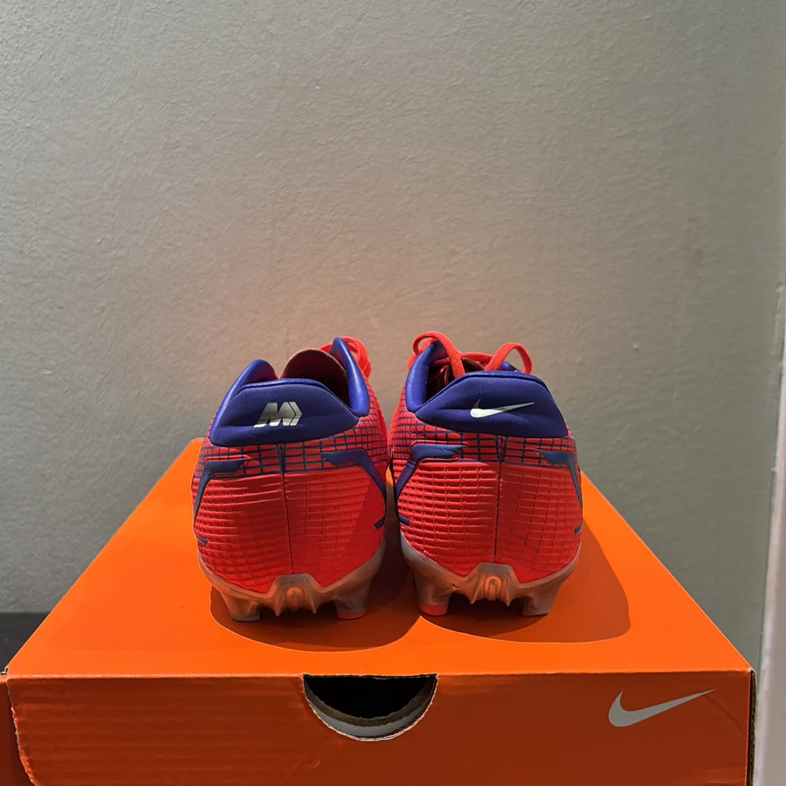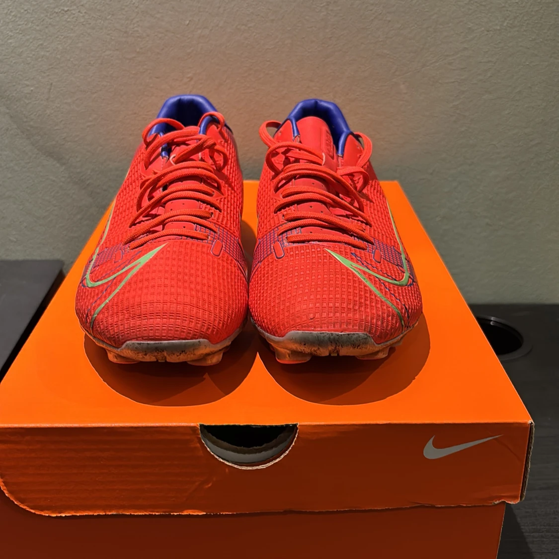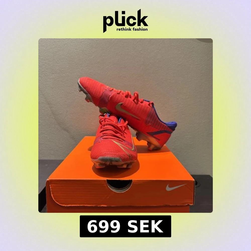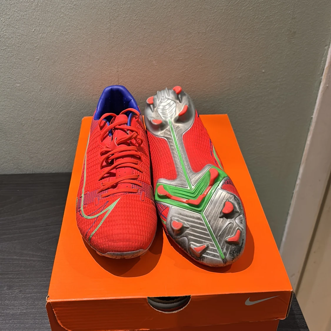 Säljer ett par röda Nike Mercurial fotbollsskor med blå detaljer och grönt Swoosh-märke. Skorna har snörning, platt sula med dobbar och är tillverkade i syntetmaterial. Insidan är fodrad i blått och yttersulan har inslag av grönt och silver. Perfekta för dig som vill sticka ut på planen.